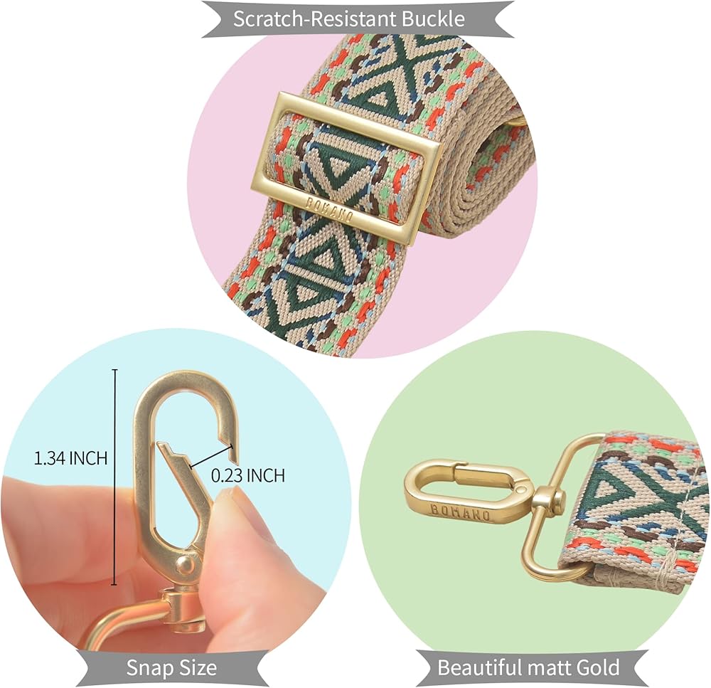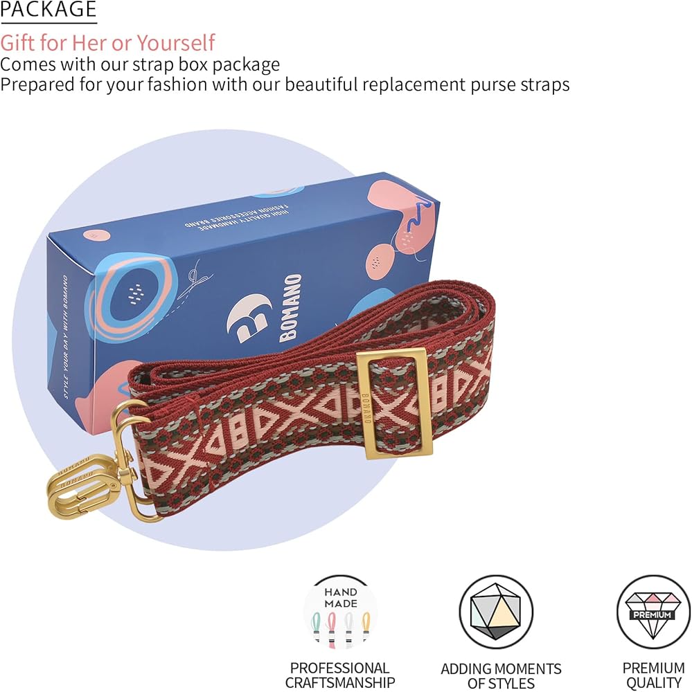 Bomano high quality embroidered bag straps are high quality made and Professional craftsmanship. The metal buckles are beautiful brass matte gold color, durable and easy to replace to other. All straps are long enough to wear as crossbady and for shoulder.