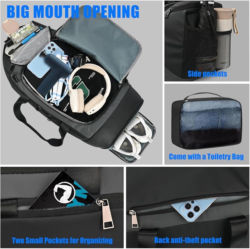 【DRY WET SEPARATED GYM BAG+SEPERATE TOILETRY BAG】The gym bag has a separate wet pocket on the side, perfect for storing wet towels, wet clothes and swimsuits. Perfect for swim practice or sweaty clothes at the gym. It comes with a bonus toiletry bag that can also be used as a carry-on pouch for your personal items.