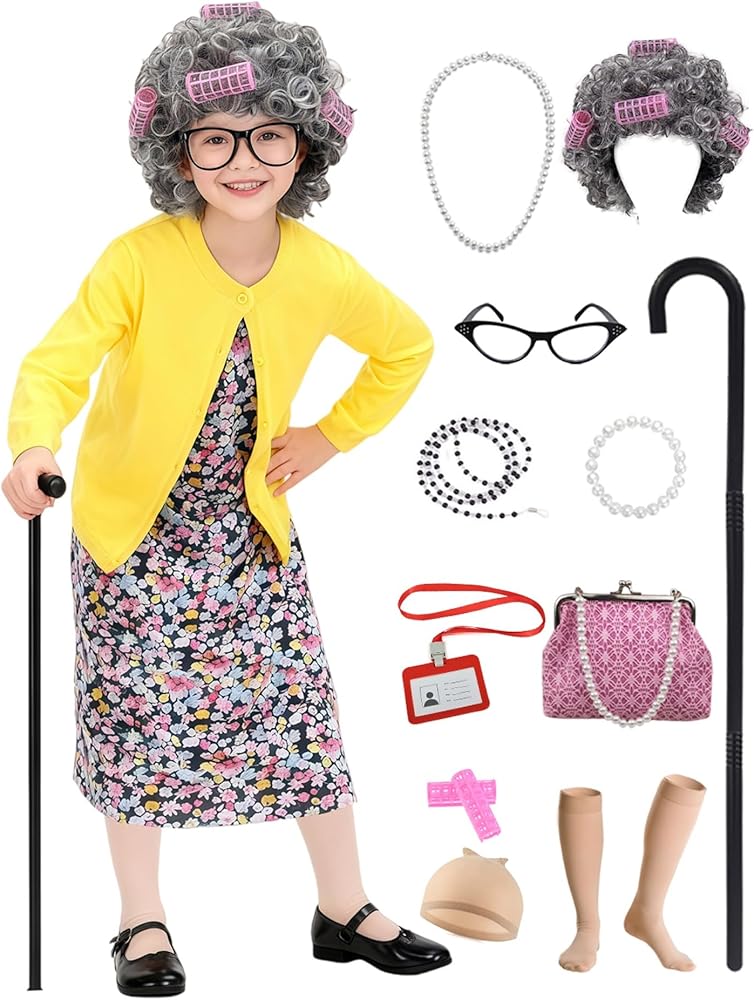 Occassions: This set of old lady costumes for girls is very suitable for the 100th day of school, 100th day celebrations, Halloween funny costume, trick or treat, and themed birthday parties, granny costume, kids grandma costume.