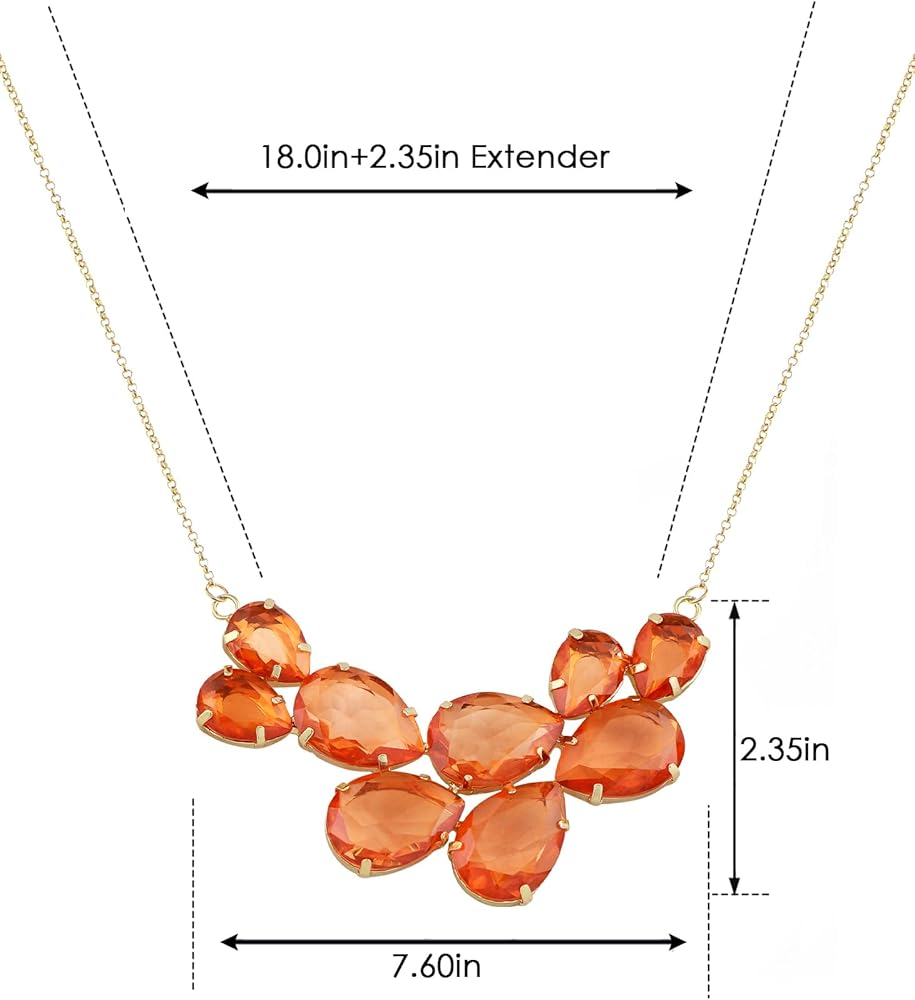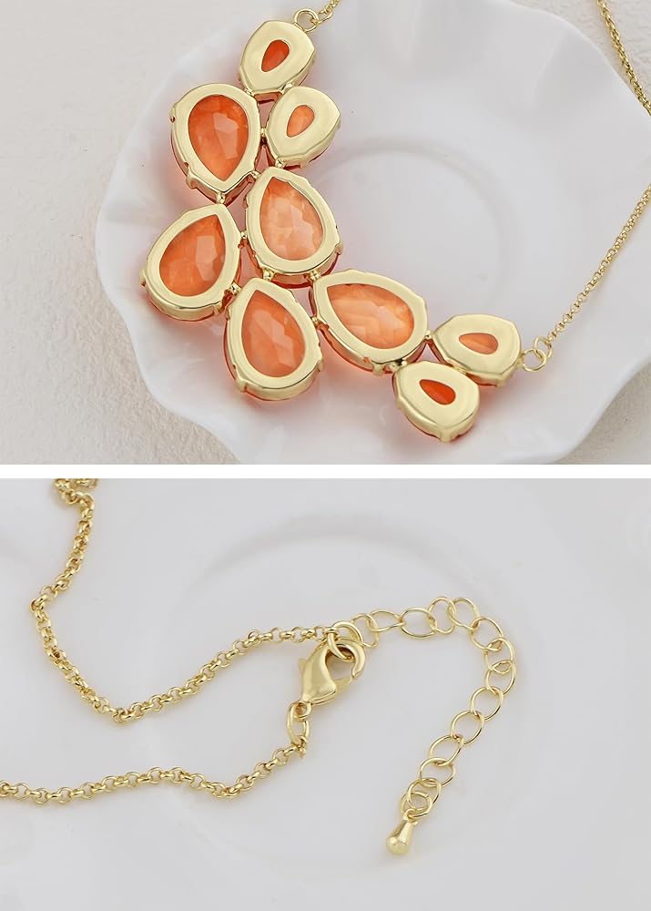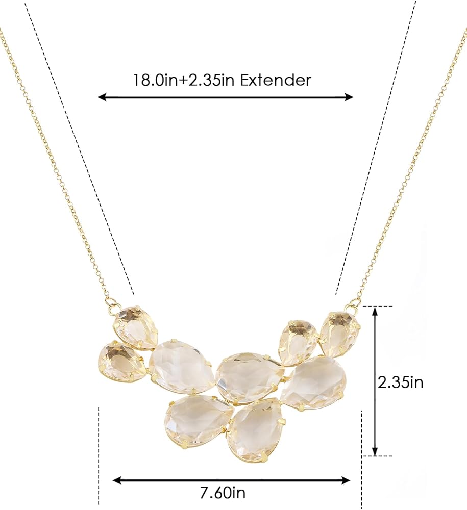 Teardrop cluster design. These soft colored stones are teardrop-shaped and arranged in a way for a unique abstract cluster design. The soft solid clear hue of the stones in combination with large stones make this a fun statement piece for fashion-forward jewelry aficionados.
