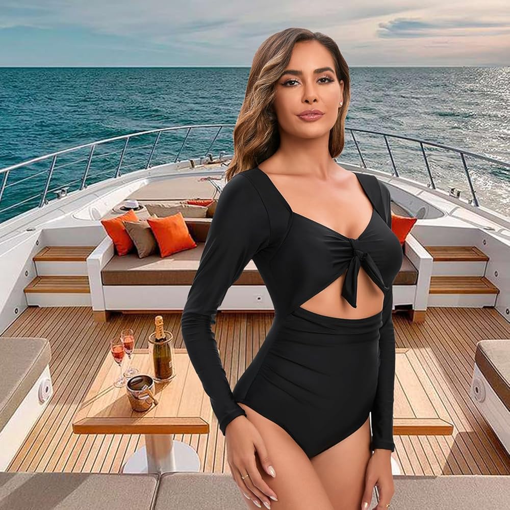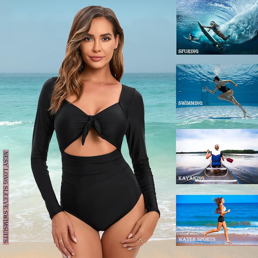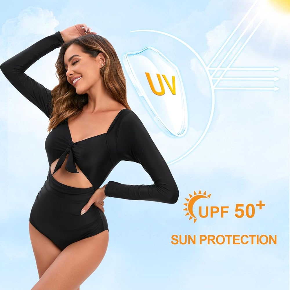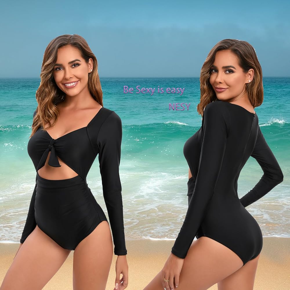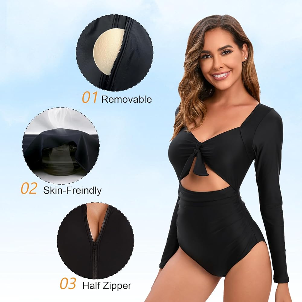 High quality swimsuit fabric: One piece women rash guard swimsuit outer fabric is 82% Nylon/18% Spandex. Soft and skin-friendly, fast drying, not see-through, very comfortable, stretchy and breathable, smooth to touch, long sleeve swimsuits for women, zipper swimwear.