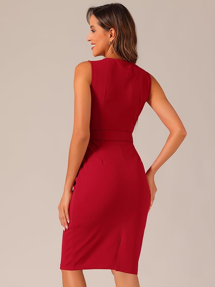 Allegra K Sleeveless Work Sheath Dress for Women's Elegant Round Neck Belted Bodycon Pencil Dress