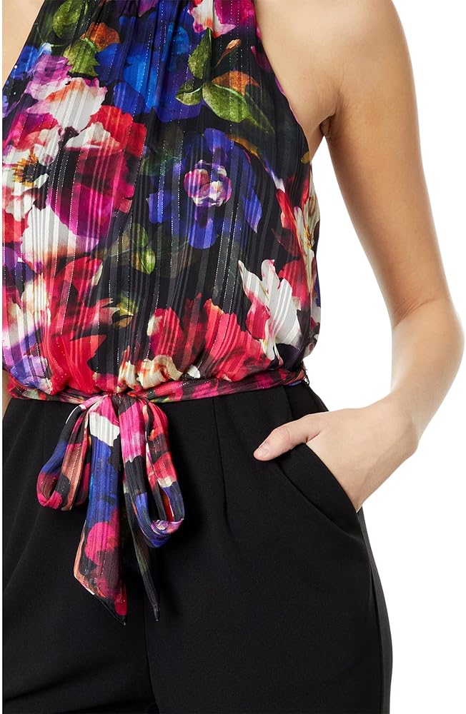 Get ready to make a statement by wearing the Adrianna Papell Mock Neck Printed Floral Halter Jumpsuit! Designed for the fashion-forward woman, this jumpsuit features a blouson bodice with a trendy halter neckline. The sleeveless design ensures optimum comfort and the self-tie waist offers a flattering fit. The floral printed metallic satin chiffon top beautifully contrasts with the solid crepe pants, exuding a modern and chic look. Two on-seam pockets. Zippered back closure. Wide-leg pants. Main: 100% polyester;Shell 2: 95% polyester, 5% elastane. Dry-clean. Imported.