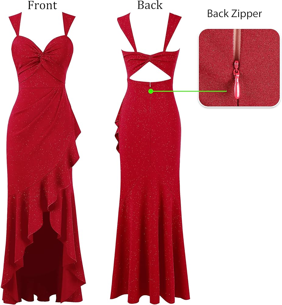 Style: V Sweetheart Neck, Wide Strap, Open Back Cut Out with Ruch, Slim Fit, Ruched Waist helps to hide the belly, Maxi Length, High Low Ruffle Split Hem, Mermaid Silhouette, A Conceal Back Zipper makes it easy to put on and take off.