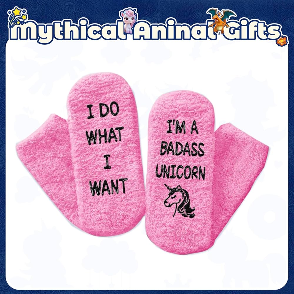 UNICORN SOCKS WOMEN: Crafted from plush coral fleece, these fluffy unicorn socks are designed to fit women's shoe sizes 6-10 perfectly. They are not just cozy but also fun, featuring humorous sayings that add a touch of whimsy.