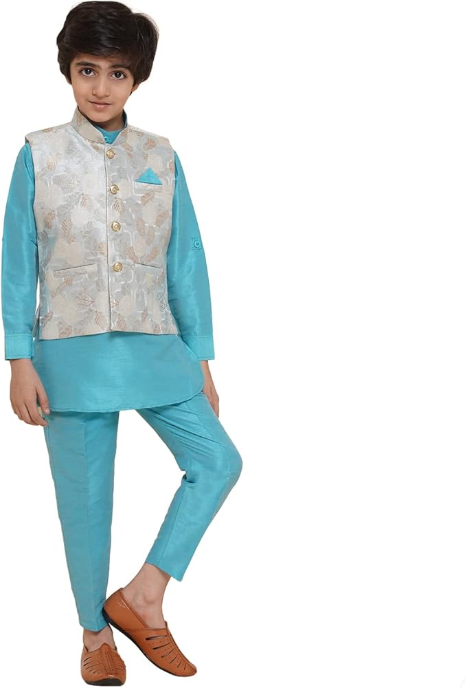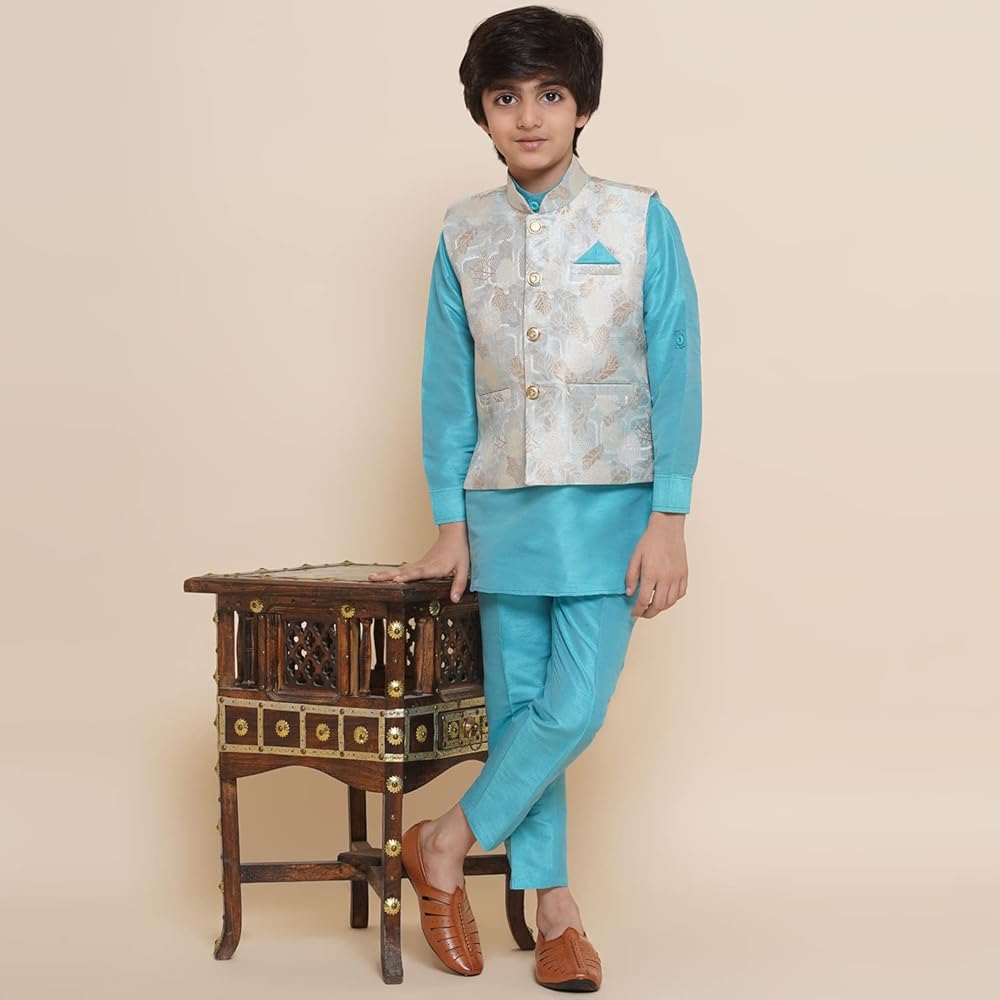 A finely crafted 3 pc ethnic ensemble is a perfect combination of modern subtlety and traditional charm. Wear this solid kurta set for a classic ethnic dress-up and pair it up with the cotton silk with jacket to notch up the look. This intricately designed attire is a great fit for your kid in this harsh summery festive season.