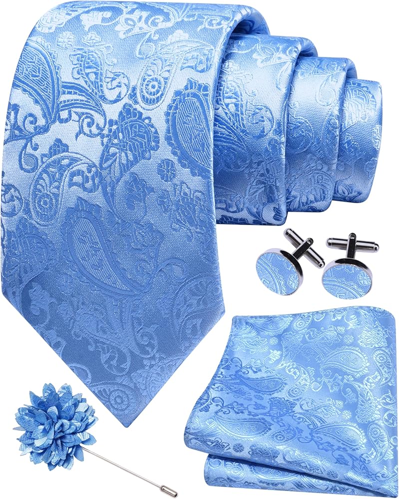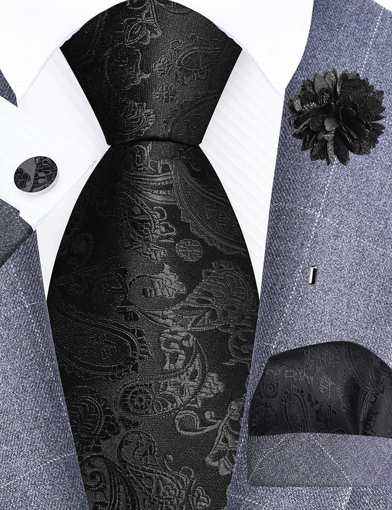 - Tie Set Including 1 Self Necktie + 1 Pocket Square + 1 Pair Cufflinks + 1 Flower Lapel Pin