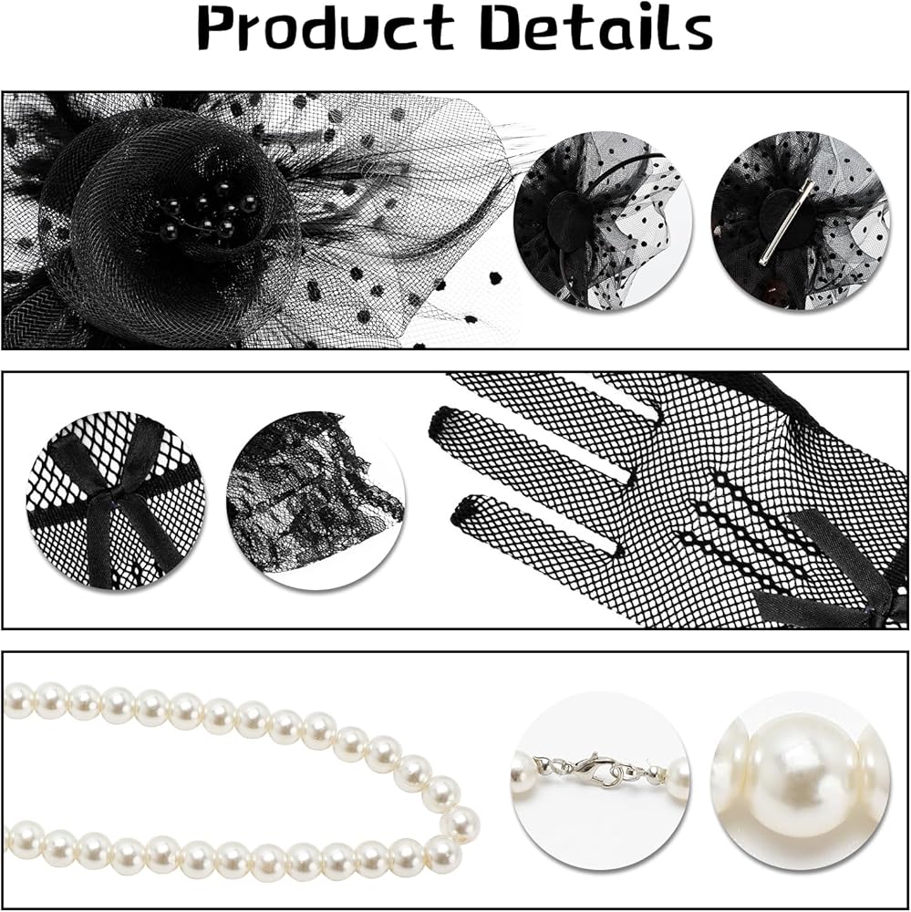 Three-piece Set: There is a feather hat in the package, a string of pearl necklaces, and a pair of lace gloves. Our three-piece set perfectly solves your matching problems. A classic top hat, paired with delicate pearl necklaces and gloves, adds highlights to your outfit.