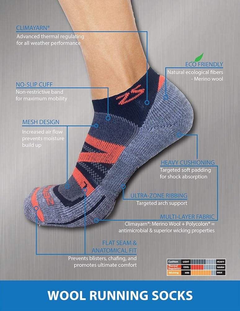 BLISTER RESISTANT: The low cut running socks feature a cushioned sole to help prevent blisters and provide light shock absorption. The unisex wool socks are designed for both men and women.