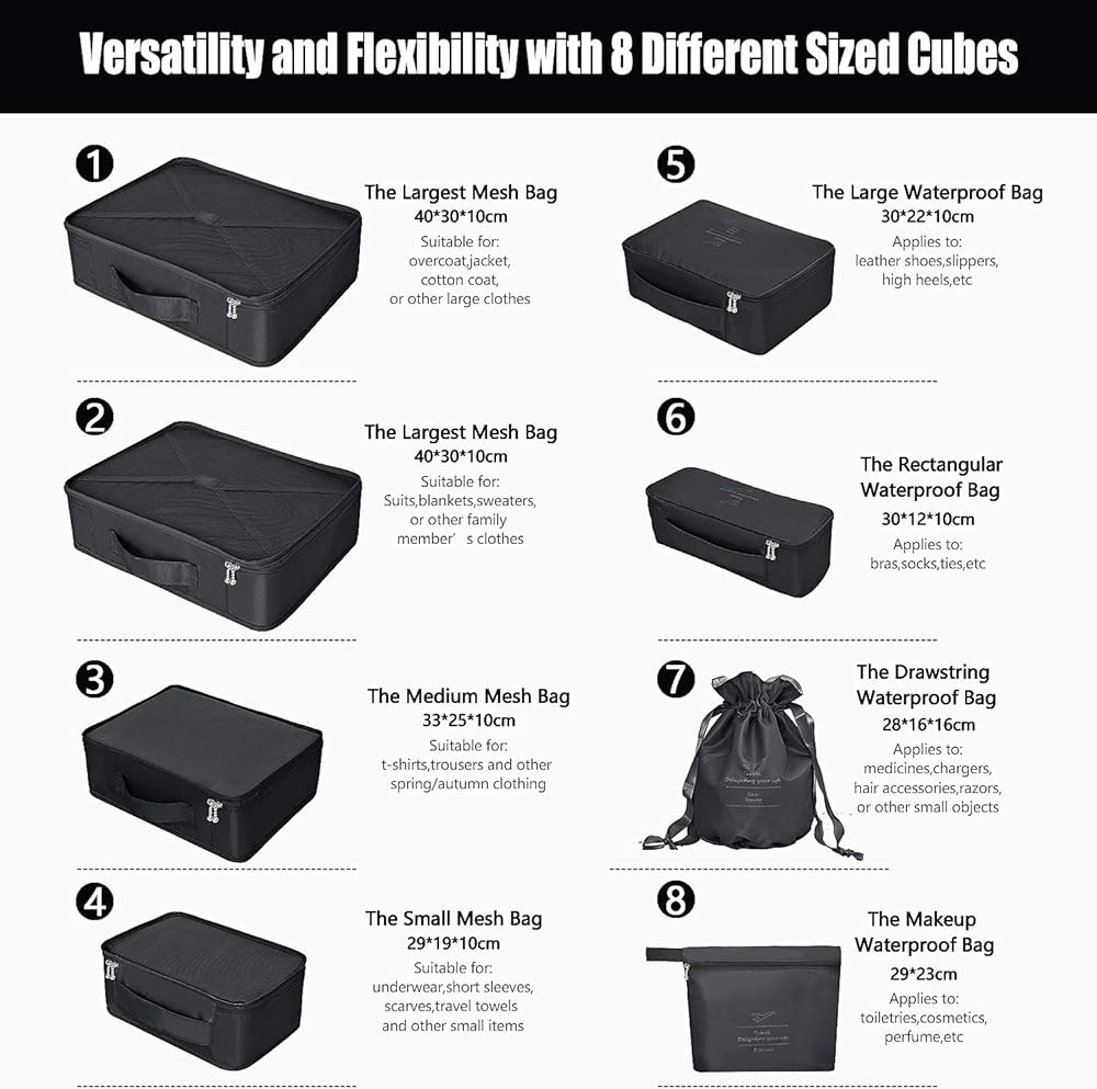 The travel bag will help you solve all your problems. The travel kit comes with eight different types of bags. Allow you to reasonably discharge clothing, underwear, toiletries, cosmetics, shoes, etc.