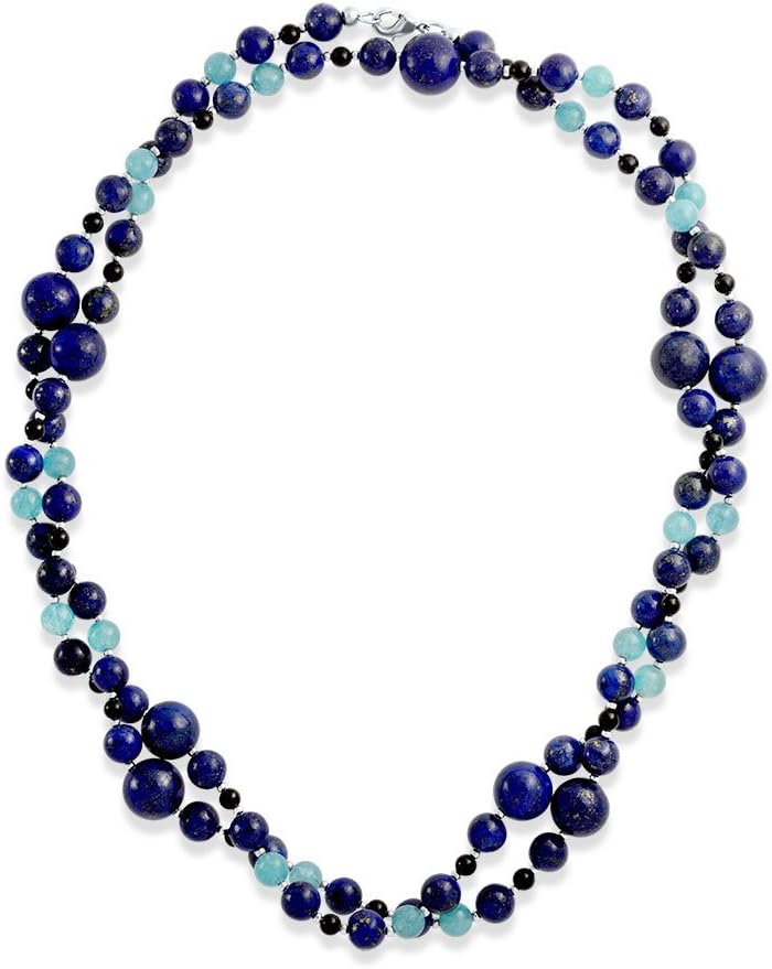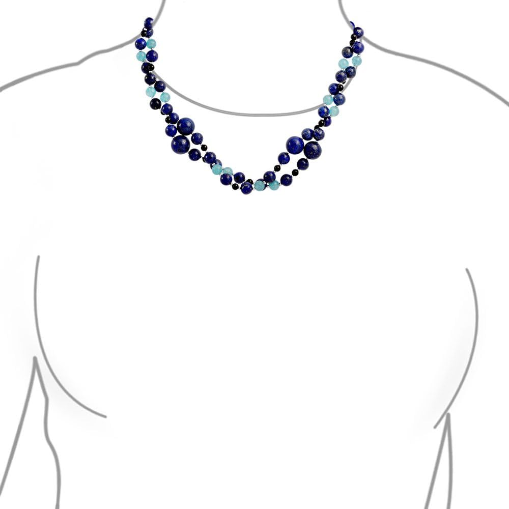 Measure: 40in x 0.5in Weight: 81.2 Grams Stone: 12, 4 and 6mm Material: Dyed Lapis, Dyed Blue Quartz, Dyed Onyx, Rhodium Plated Brass