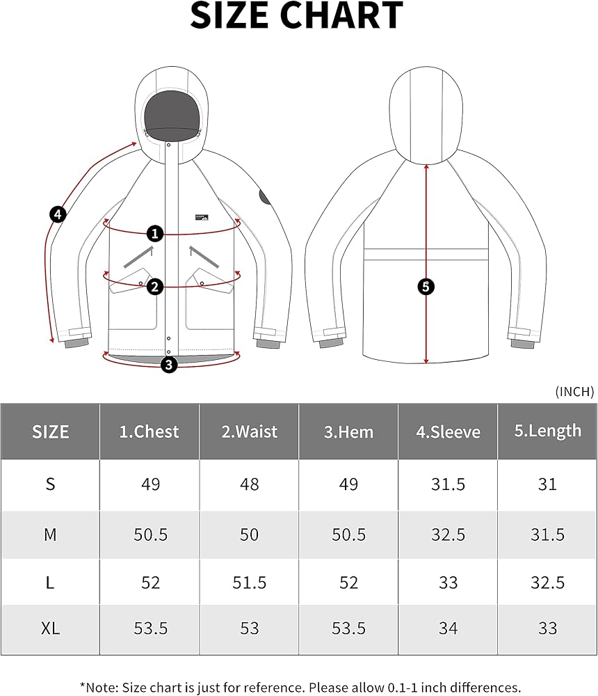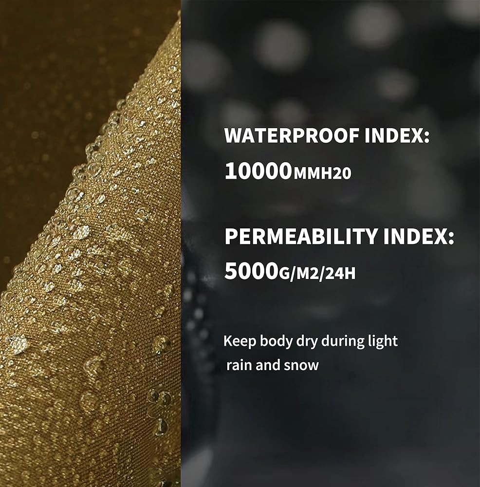 Waterproof & Moisture Absorption - Waterproof Index:10000mmH20, Permeability Index: 5000G/M2/24H. Provides continuous protection and keeps the body dry during light rain and snow.