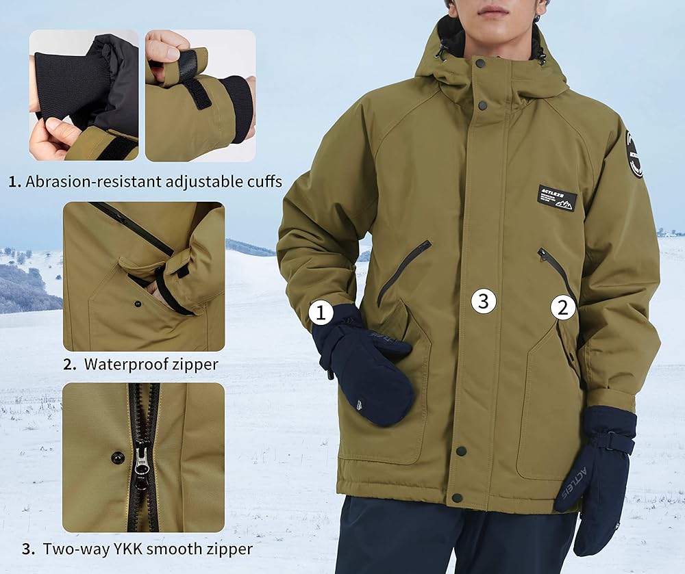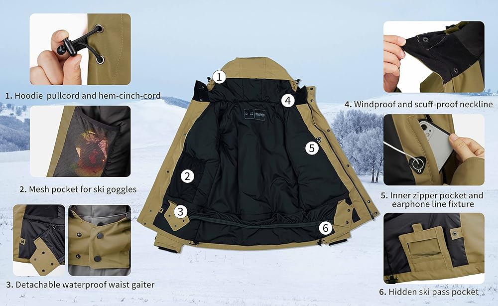 Multiple Functional Design - Hoodie with pullcord, Anti-loss headphone cable slot, two-way YKK zipper durable and smooth, velcro elastic adjustment wear-resistant threaded double cuffs, double layer waterproof zipper pockets. Stowable ski pass pocket, inner mesh pocket for ski goggles, detachable waterproof waist gaiter can effectively prevent snow from entering the lining in the event of a fall.