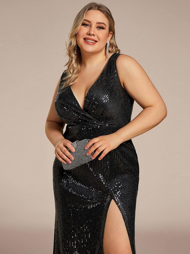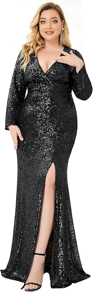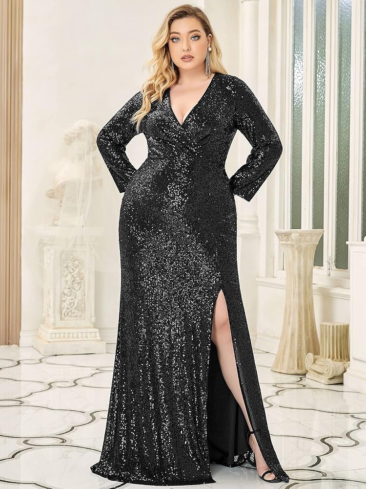 This side split sequin dress features deep V-Neck, long sleeves, front wrap design, floor length evening gowns