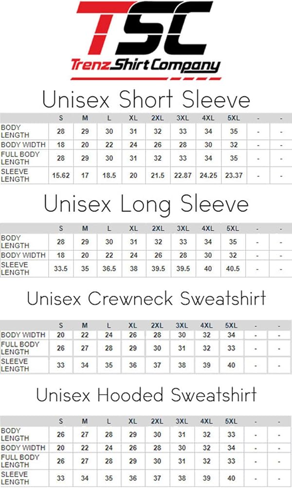 UNISEX FIT: Unisex sizing fits both men and women but is based on standard mens sizing. Larger size t-shirts may cause the print to appear smaller. Oversized t-shirts are bvery popular, size up if you prefer a more relaxed fit. Size chart: small L28xW18, Medium, L29xW20, Large L30xW22, XL L31xW24, XXL L32xW26, 3XL L33xW28, 4XL L34xW30, 5XL L35x32.
