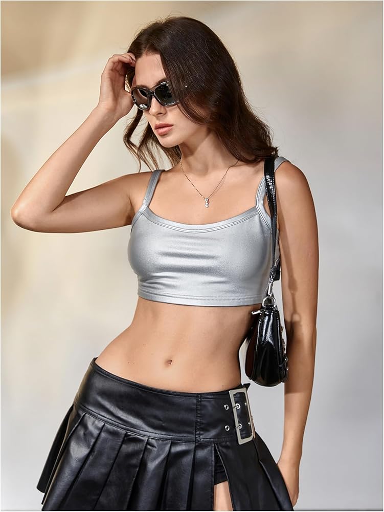 - Feature: sleeveless, straps, scoop neck, looks shiny, sexy style, pleather tops for women