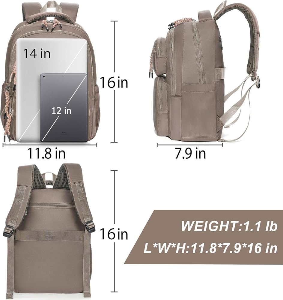 Travel Laptop Backpack Women, 14 Inch Laptop Backpack with Luggage Belt, Water Resistant Work Backpacks, Multi-Pocket Computer Backpacks for Commute, Brown