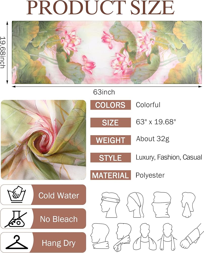 The chiffon scarf can be worn around hair, head, neck, shoulder or waist, simple to create various styles according to your matching, portable for easy to store into your bags, providing you with a reassuring use experience.
