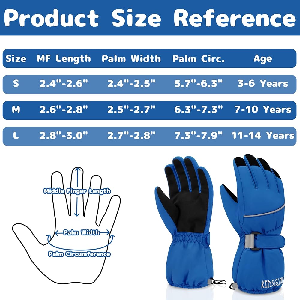 SIZE INFORMATION: Boys & girls snow gloves of three sizes for kids ages 3-14. Size-S for 3-6 years old; Size-M for 7-10 years old; Size-L for 11-14 years old. The age recommendation is only for reference, please check size chart to get the product in the most suitable size.