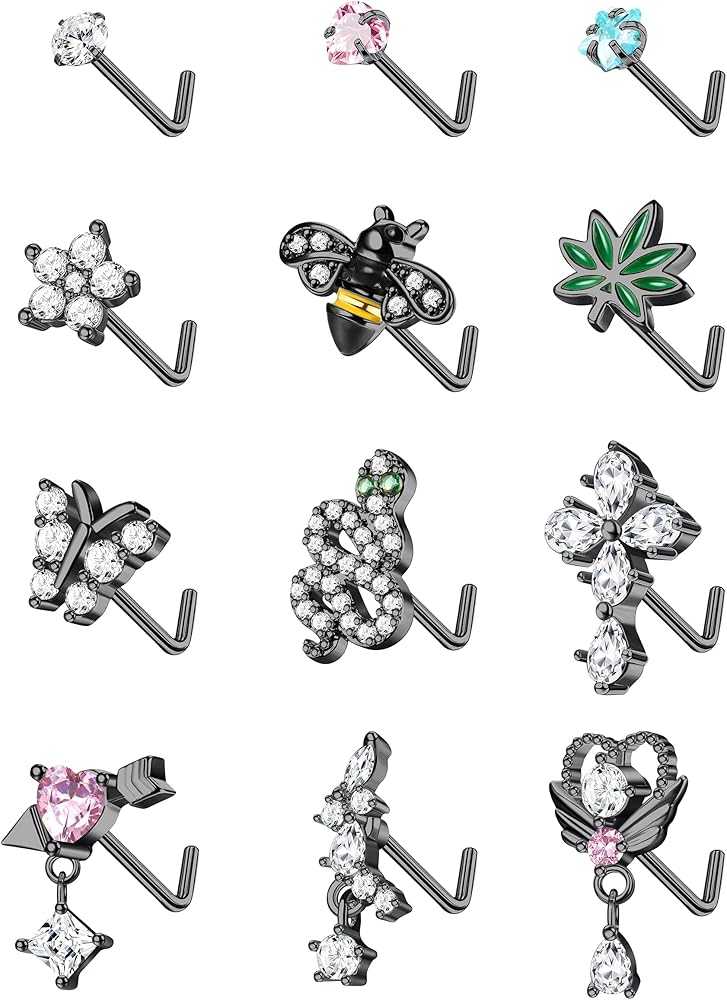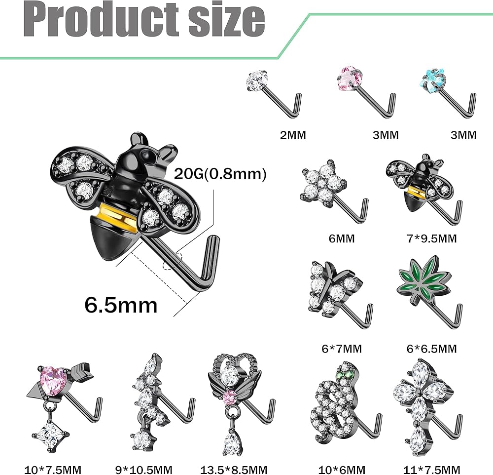 🍈20G NOSE RING SET: One Order Comes with 12Pcs L Shaped Nose Rings Including Dangle Nose Rings, Cubic Zirconia Nose Ring, Butterfly Nose Ring, Heart Nose Ring, Snake Nose Ring, Bee Nose Ring, Flower Nose Ring, Star Nose Ring Etc, A Variety of Styles to Choose From, Classic and Stylish Designs, Make Your Tall Nose Look More Charming
