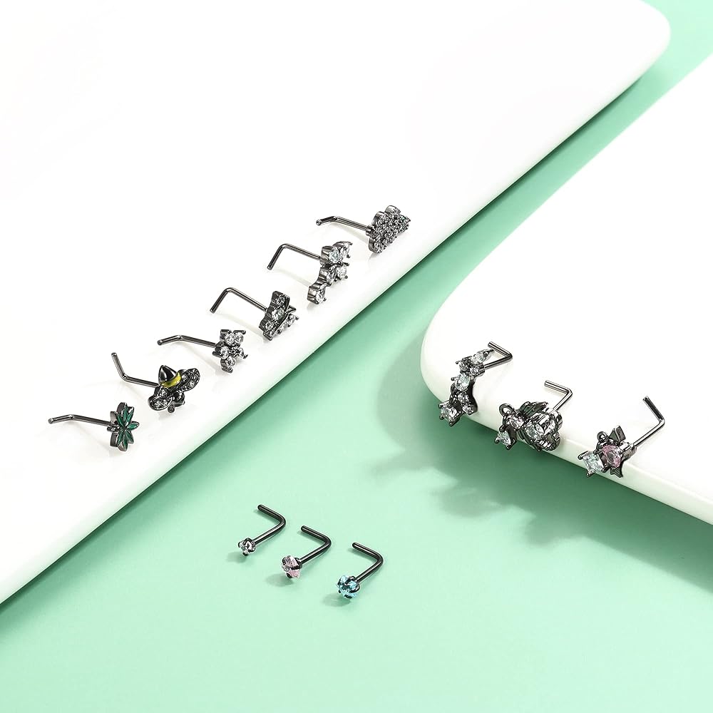 Drperfect 12Pcs 20G Nose Rings Studs L Shaped Dangle Nose Rings for Women Stainless Steel CZ Heart Snake Flower Butterfly Assorted Nose Nostrial Piercing Jewelry