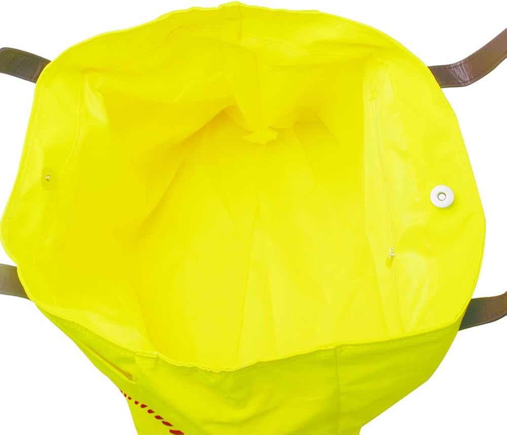 The material is canvas. The bag has a snap closure. The totes measure 16.5x7x12.5 inches ,Brown faux leather Double Handles with 10" Drop