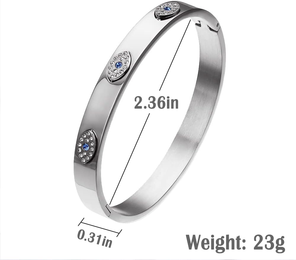 Great Design: The circle size of this stainless-steel bangle is 7.5 inches, embossed evil eye amulet. The weight is 23g.