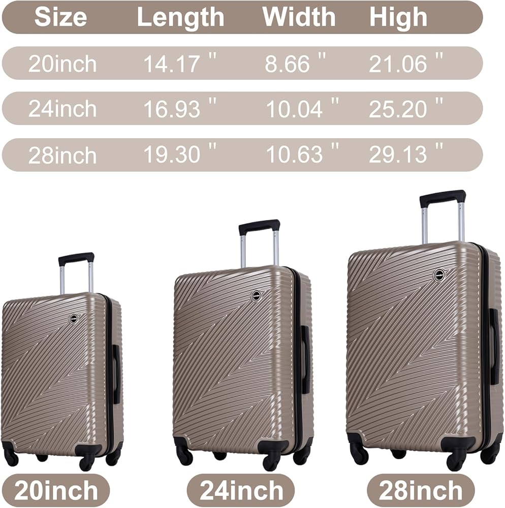 【3 Piece Hard Luggage Sets】: Tripcomp 3 piece luggage set comes in size 20 inch carry on, 24 inch checked luggage and 28 inch checked luggage, airline size requirements. Made of lightweight and durable PC+ABS material, with an impact-resistant hard shell, that's abrasion, and water-resistant.