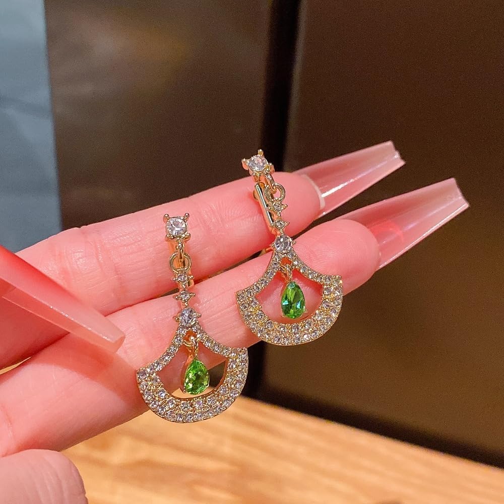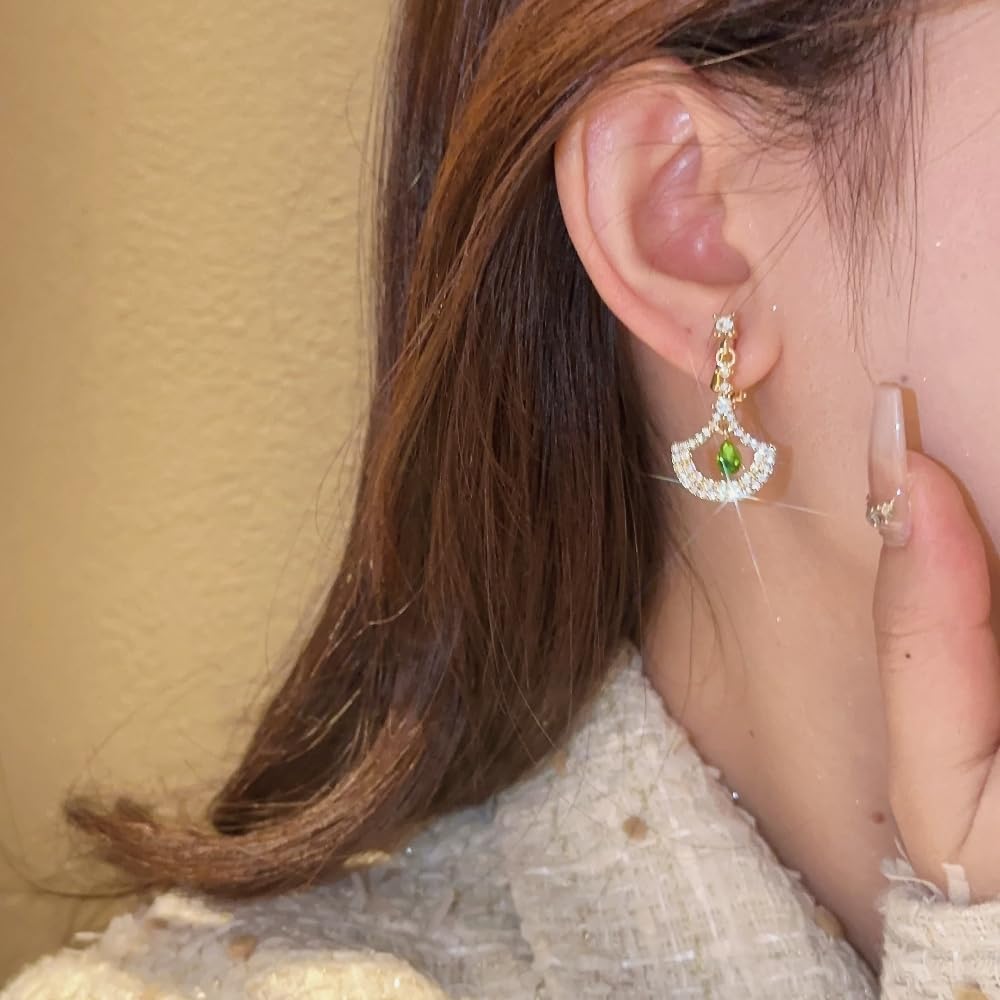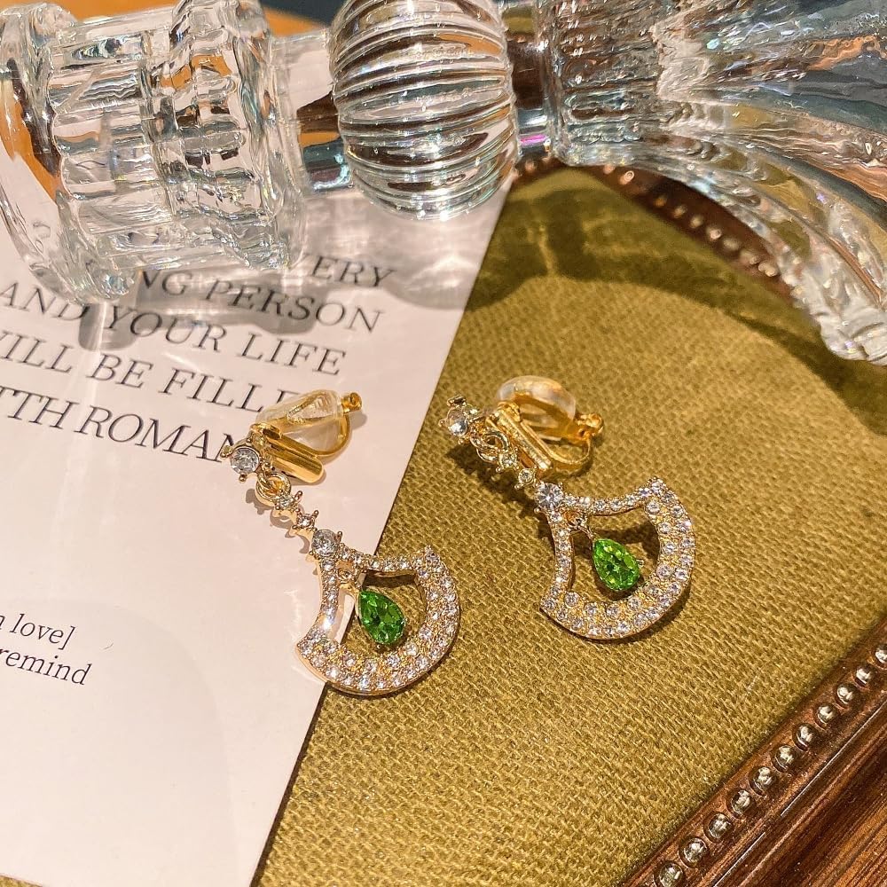 High Quality Material&Unique Design:In Size Of 1.25inch*0.66inch,Gold and Green Color.These Ear Clips are Made of High Quality Alloy,Fastness,Decorated With Superior Zircons,Which Shine Brighter.These Earrings Clip On are Designed in A Unique Fan Shape,Fully Drilled and With A Green Water Drop Zircon in the Center ,Makes it More Elegant and Classic in Daily Wear.