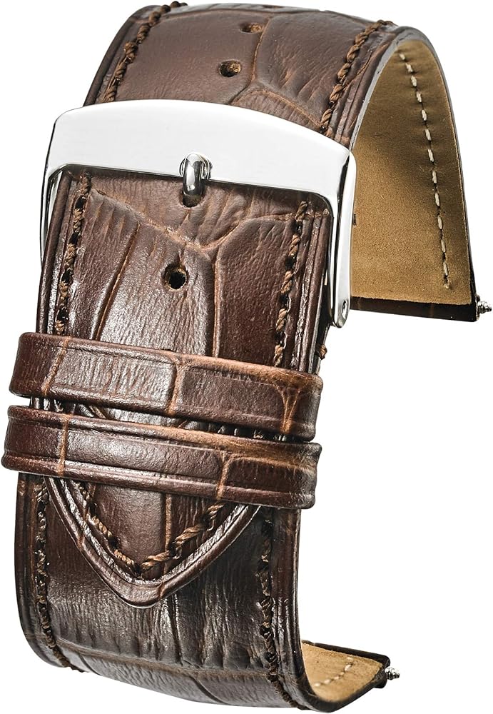All our watch straps including back lining is made of genuine full grain leather. Our bands are of the highest quality which means we do not use split or bonded leather. This ensures that our bands do not crack after continuous wear. All of our bands have their keepers (moveable loops) both glued and stitched to reinforce their strength. We use only the best quality of stainless steel buckles. Unlike brass buckles, which often turn green after wear, our quality stainless steel buckles are hypoallergenic, and keep their colour even after long-term wear. All of our leather bands are warrantied for 1 year against any manufacturing defects.