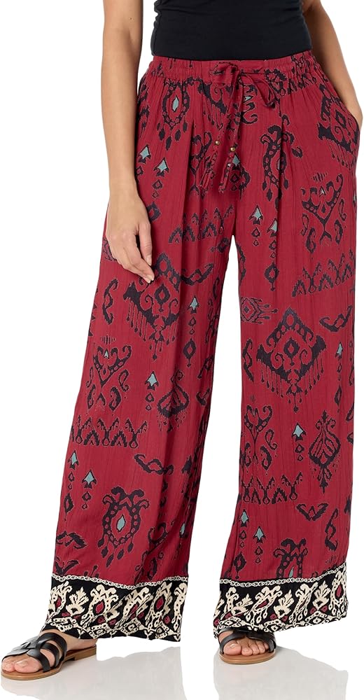 Angie Women's Tie Waist Palazzo Pants with Pockets is a stylish and comfortable pant. Features an adjustable tie waistband and pockets on the sides. These bohemian print pants are great for running errands or work.