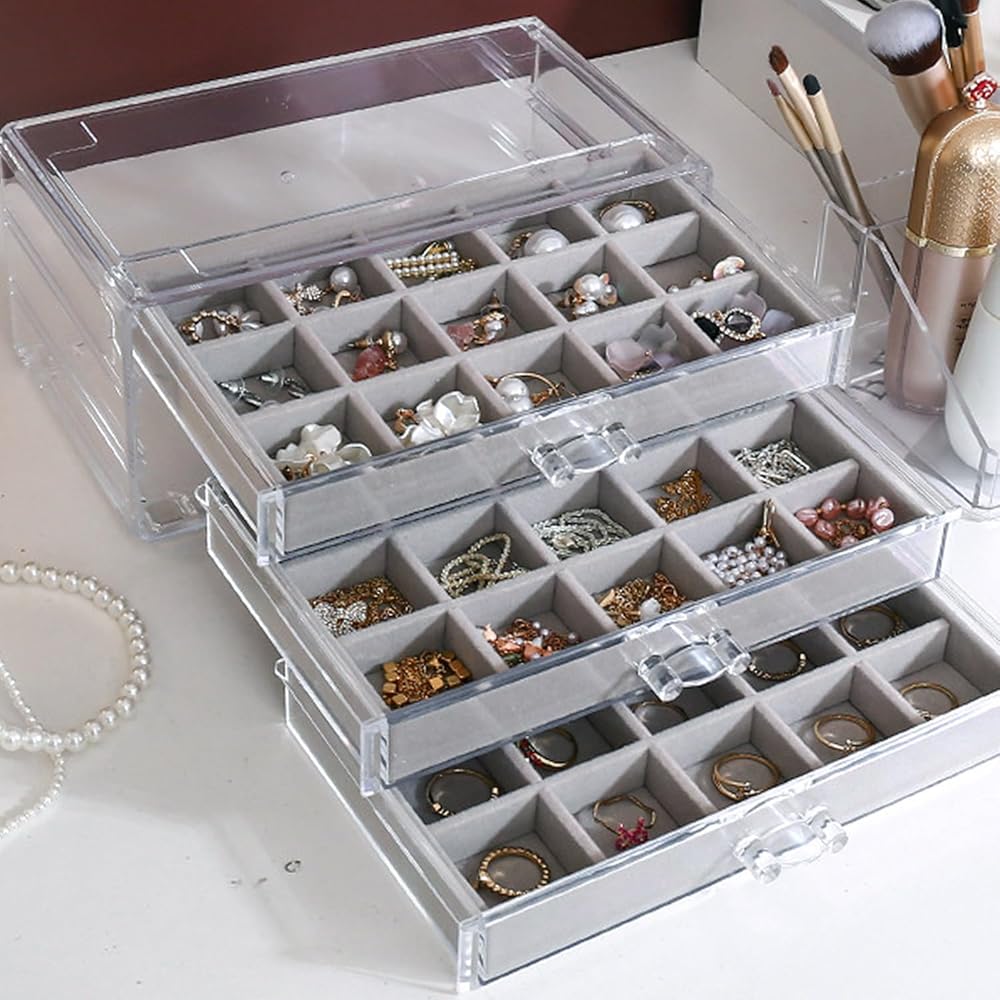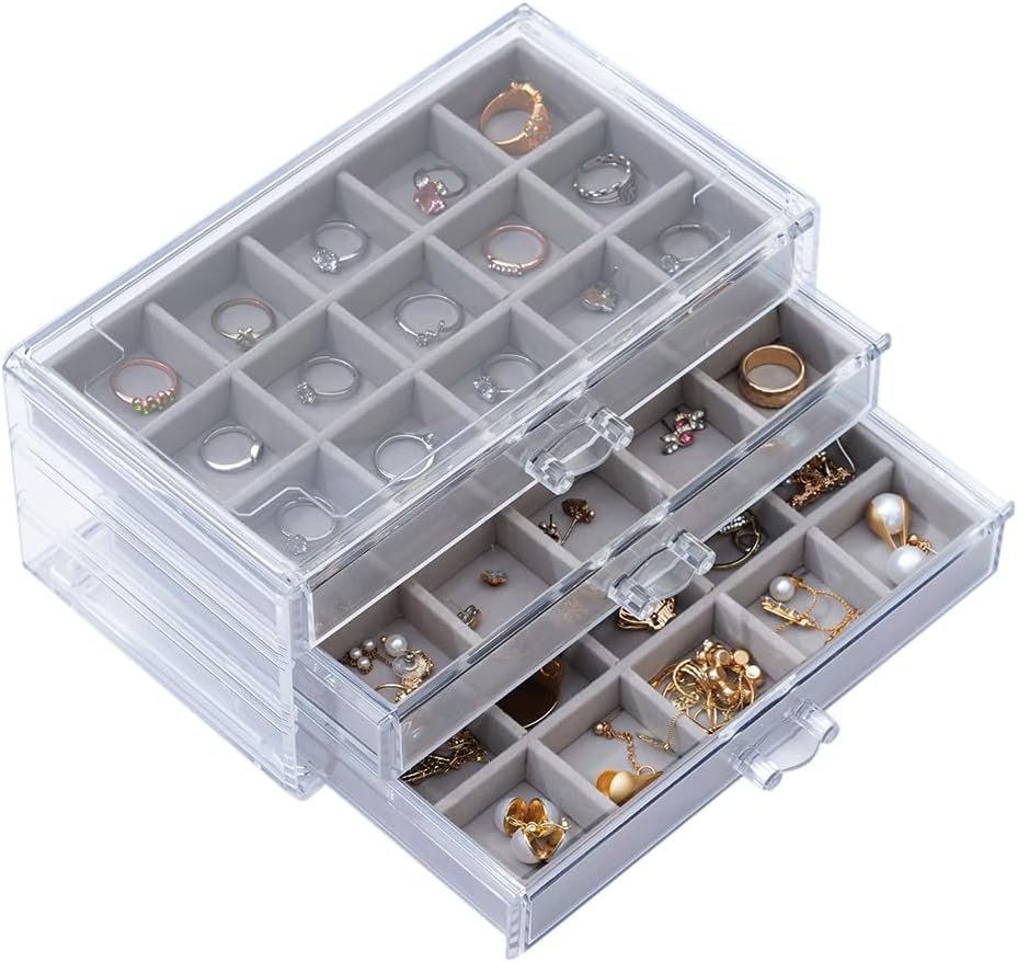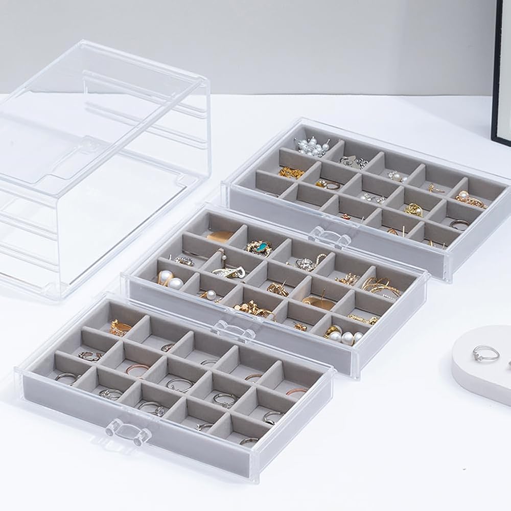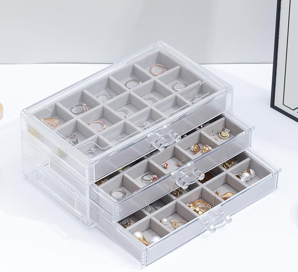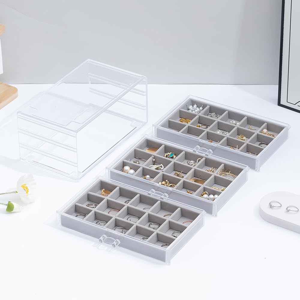 【3 Drawers】Acrylic storage box dimension: 9.4″ x 5.8″ x 4.3″. Each of the drawers has 15 small compartments of the same size. And you can stack 2 jewelry boxes or more.