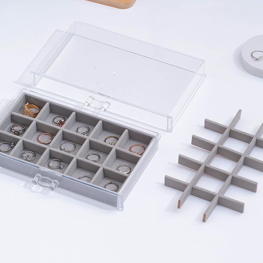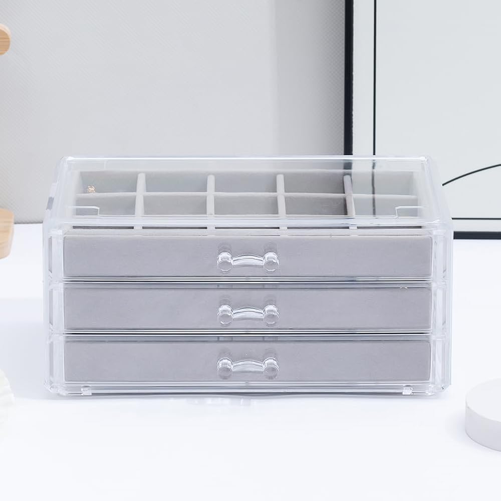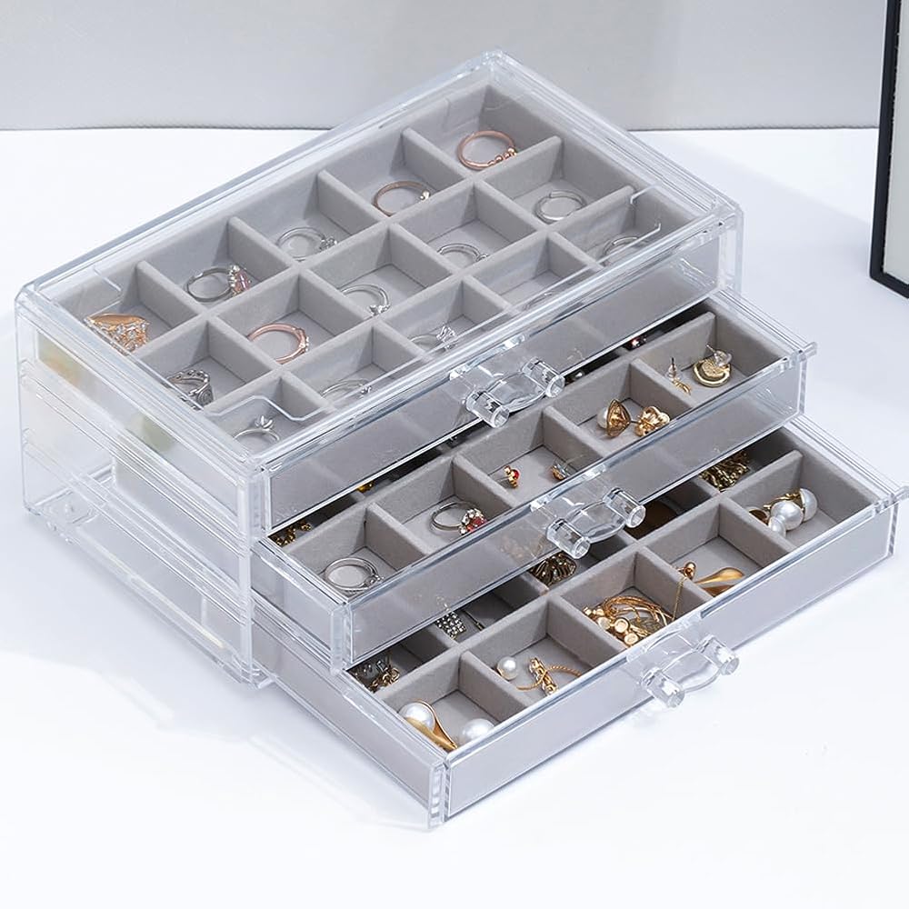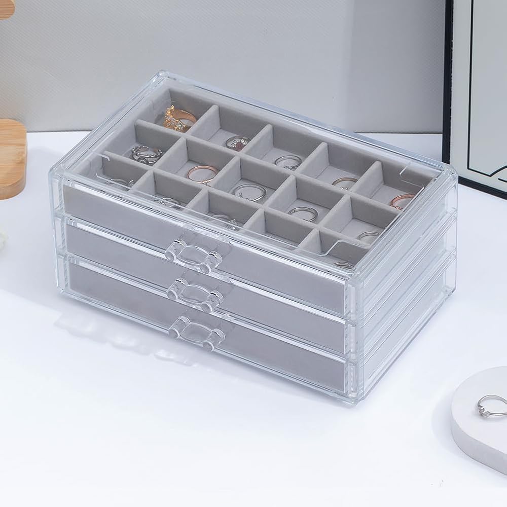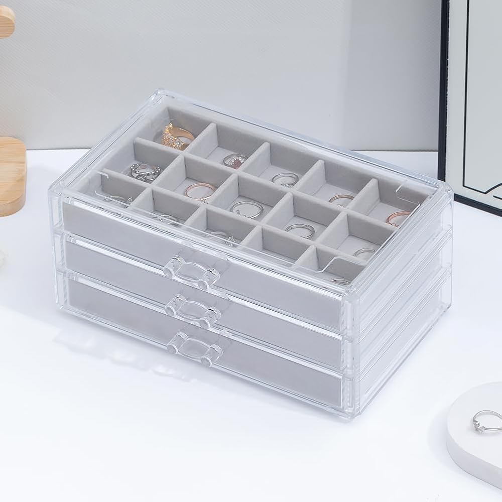 【3 Drawers】Acrylic storage box dimension: 9.4″ x 5.8″ x 4.3″. Each of the drawers has 15 small compartments of the same size. And you can stack 2 jewelry boxes or more.