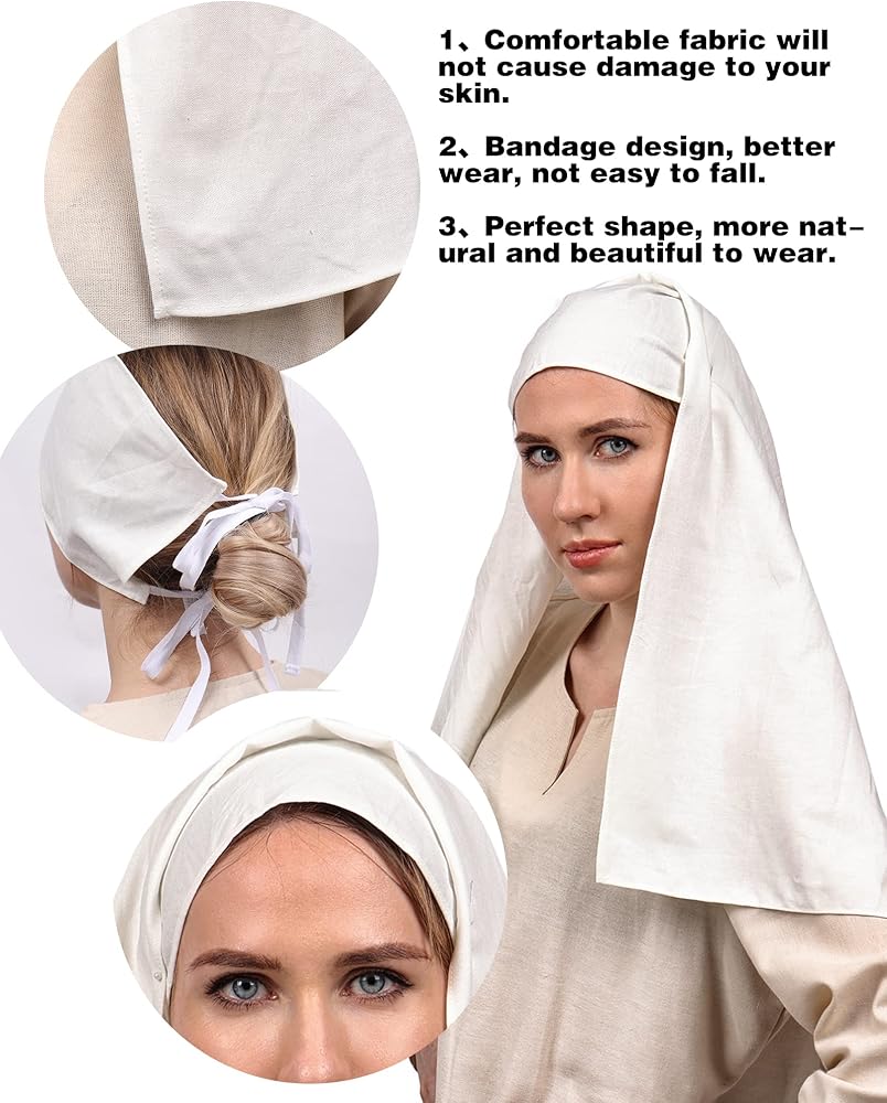 Linen Material: Medieval headscarf hats are made of high-quality cotton and linen. This material will be thicker and feel softer. It won't harm the back of your ears or hair. Wearing it will feel comfortable enough