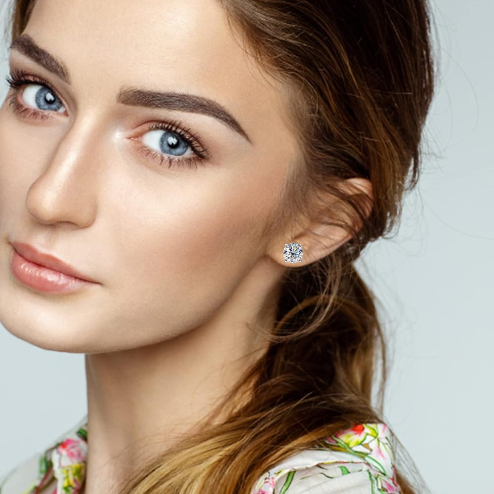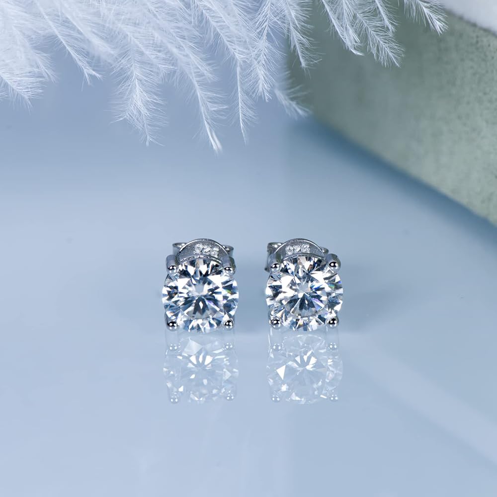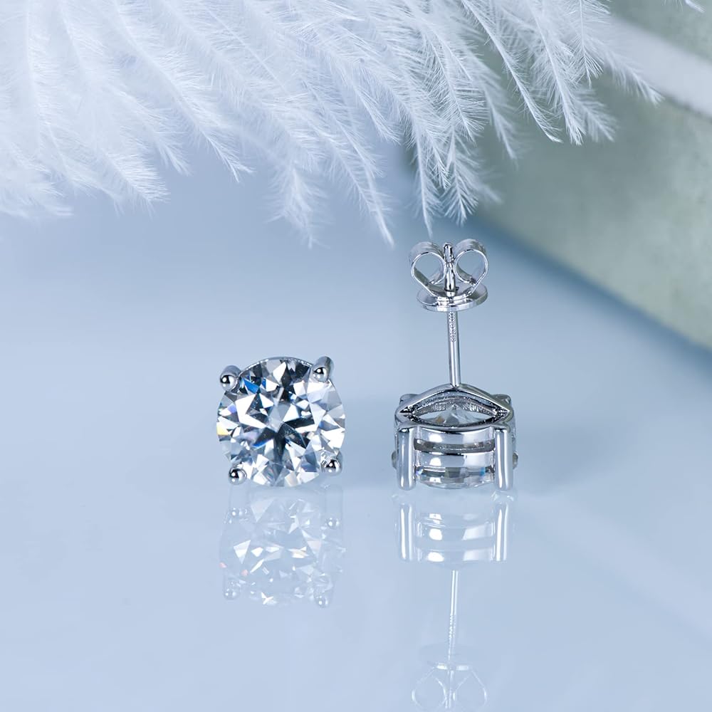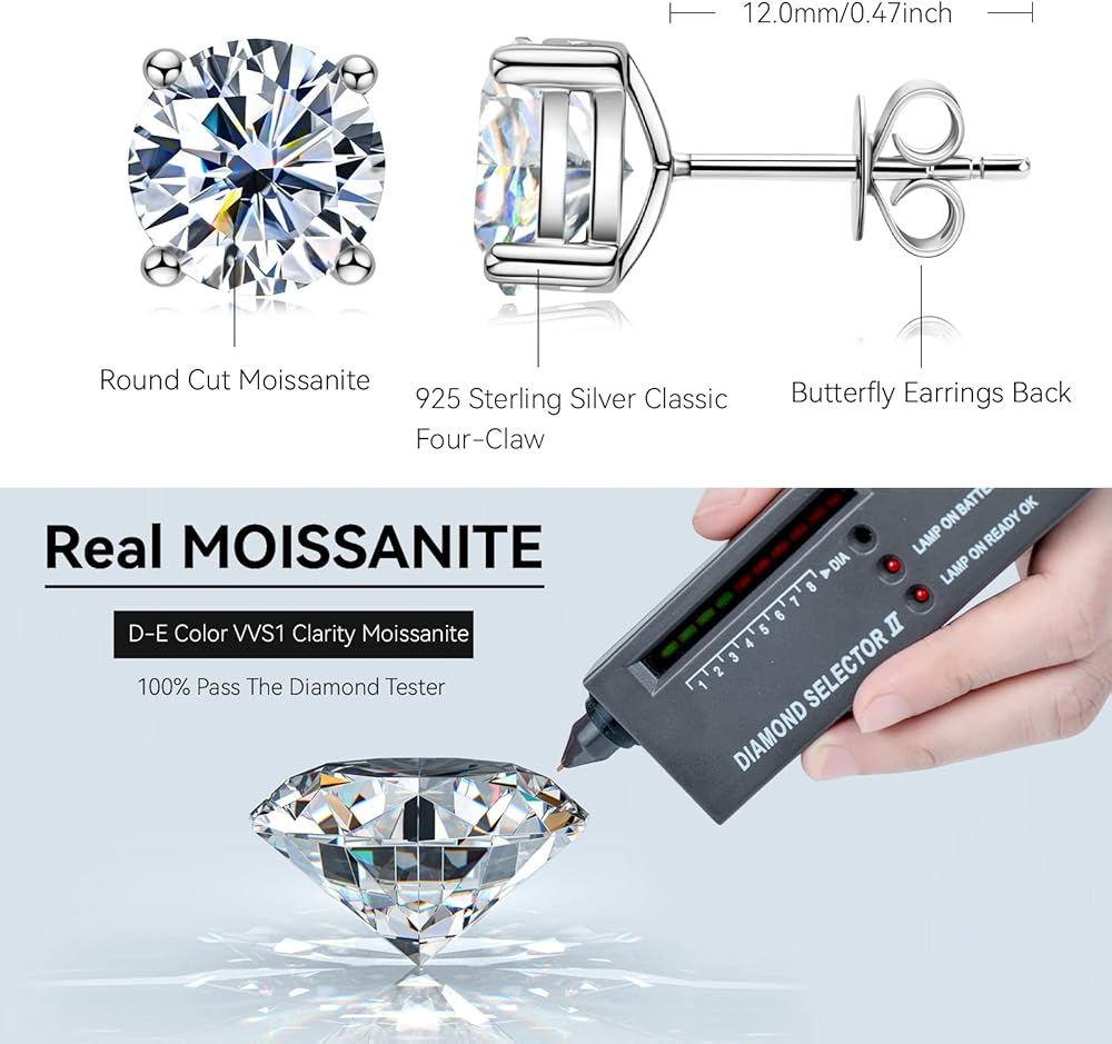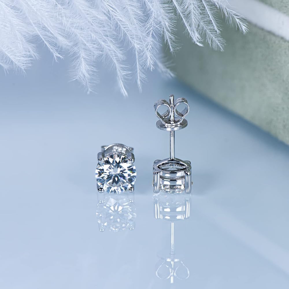 🎁Silver Stud Earrings:🎁 925 Sterling silver stud earrings are set up with four-claw solitaire brilliant moissanite. Round cut with excellent polish and symmetry, to maximize the brilliance of a traditional round moissanite diamond. The Sterling silver butterfly back design is very safe and comfortable, not loose or fall off, even if sleeping with wearing. Moissanite stud earring goes perfectly with every outfit and is suitable for every occasion.