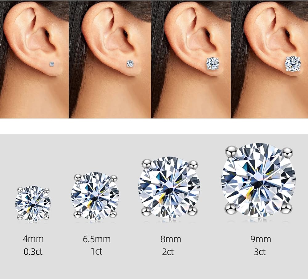 🎁Real Moissanite Diamond:🎁 Moissanite diamond earrings are set up with 0.3ct/4mm moissanite, a total of 0.6ct per pair DF color, VVS1 Clarity. Please see the size details carefully before you place order. Moissanite shines brighter than a diamond or any other gemstone and you'll never get tired of seeing the sparkle from all angles! Moissanite is tougher and will not chip as easily or lose brilliance as fast thus making it a good choice for you.