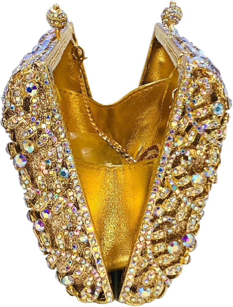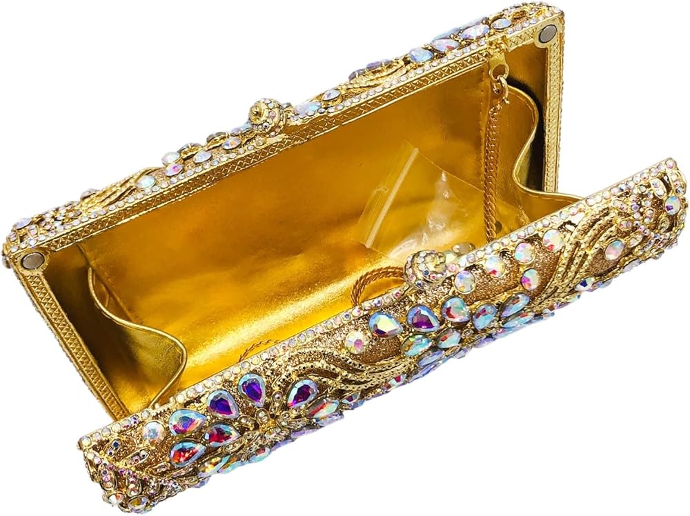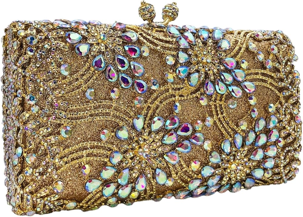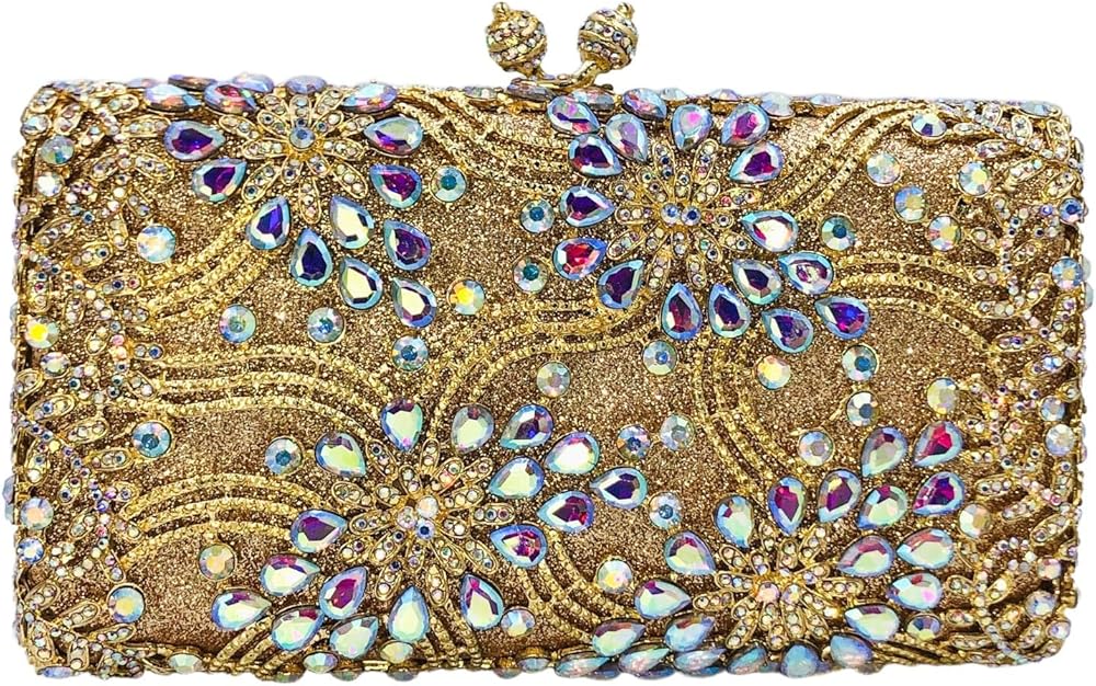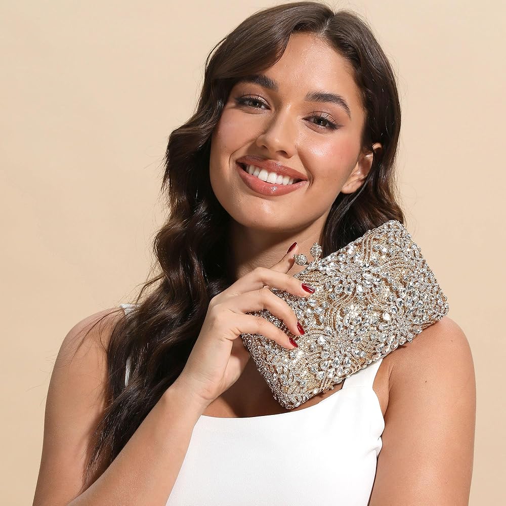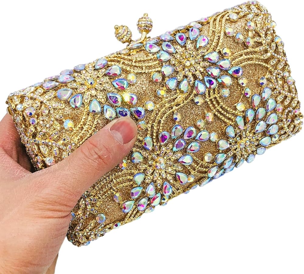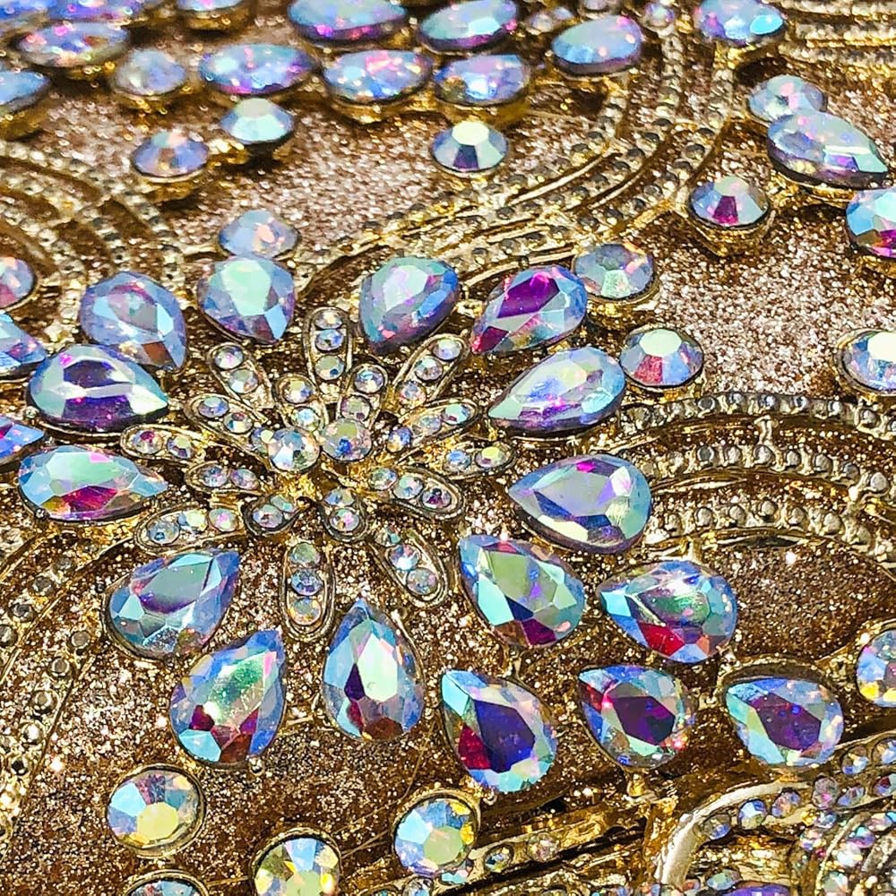 [ Material & Details] - This Flower Evening Bag, we use the Diamonds, which are well selected and Shiny, are hand-applied by Skilled Workers on Solid Metal Frame, Shine Glitters Material Hidden under the Frame which Matches the crystals, makes more Bling Bling. Soft Metallic Faux PU leather lined interior. Magnet Closure.