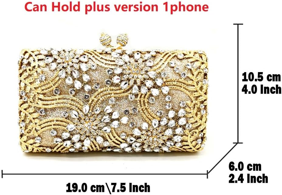 [ Size & Weight ] - This is a Small Flower Minaudiere Bag : 7.5x4x2.4 inches, which is about 19x10.5x6 cm. It has enough capacity, can hold for Iphone XS Max XR proXSSE8, and is available for Lipsticks, Keys, Tissues and credit card. This Rhinestone Handbag is not heavy, though it is made of Fine-Work Metal Frame, the net weight is about 1.5 LB which is about 0.7 KG.