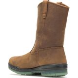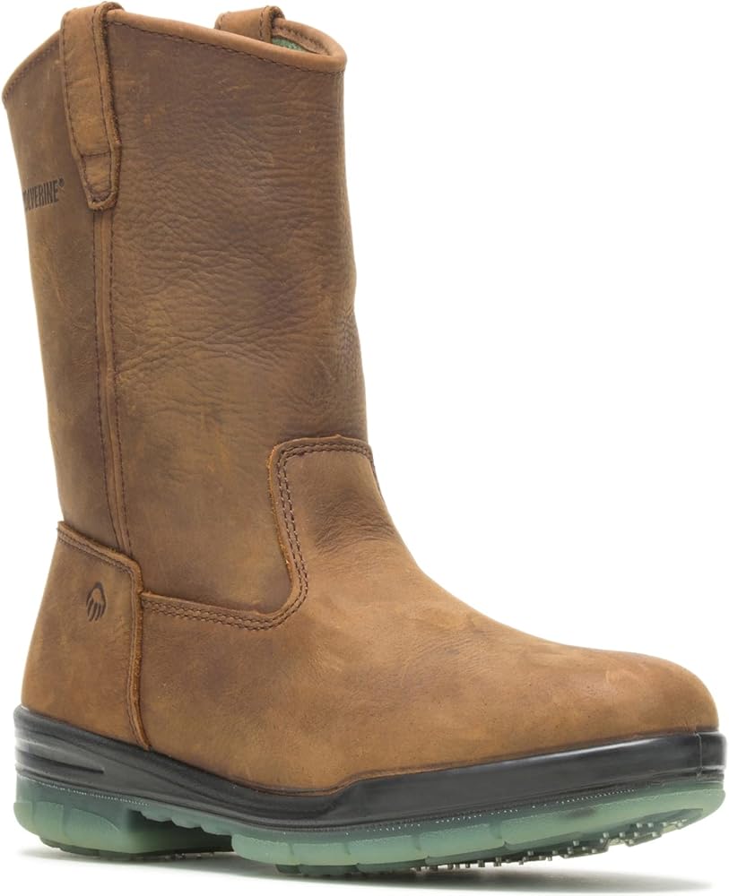 This rugged 10-inch pull-on boot from Wolverine is built to stand up to tough outdoor work, while keeping you comfortable and looking pretty good as well! Constructed from thick, oiled full-grain leather, the Wellington-style boot is equipped with Thinsulate™ Insulation for extra warmth, a moisture-wicking lining to keep your feet dry, and a comfortable cushioning system to help you stay energized throughout the day. The rugged all-rubber outsole provides excellent traction on a variety of surfaces and terrain, while the lightweight fiberglass shank provides support through the midfoot of the shoe, reducing stress and fatigue. This boot also has an optional steel toe.