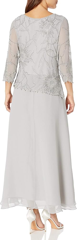 This stunning dress is a must-have for making any special occasion unforgettable! The beaded bodice with scalloped edging adds the perfect touch of feminine charm, while the mock pieced design and solid skirt create a gorgeous silhouette. Styled with sheer three-quarter sleeves, asymmetrical popover bodice and a flared.