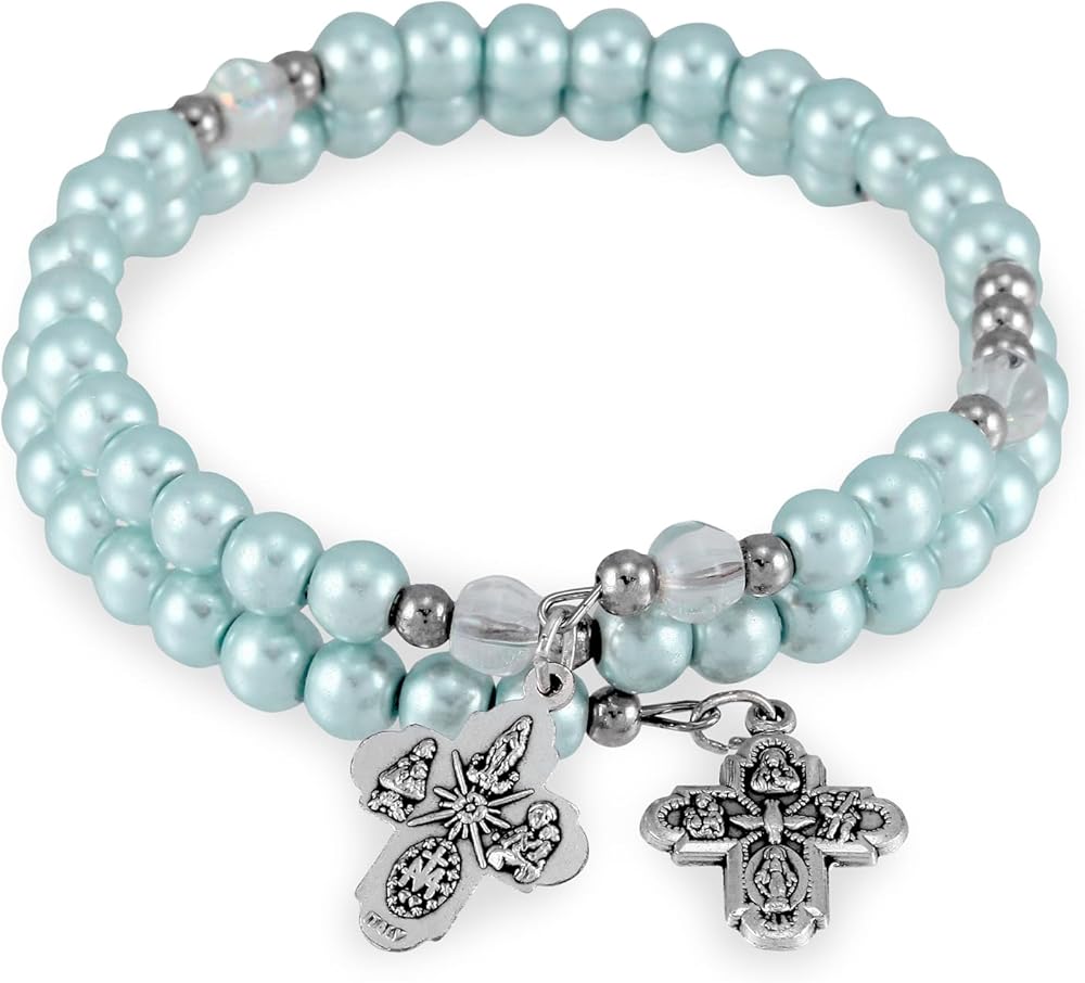 Wrap-around bracelet design made with silver tone memory wire. Bracelet is made with 6mm blue glass beads, each Our Father section is made of 3mm silver tone beads and one 6mm clear glass bead. Includes one 3/4 inch (1.9cm) Four Way Cross charm and one 1/2 inch (1.27cm) Our Lady of Grace medal. Total Length 8 1/2 inches (21.6cm). Adjusts to most wrist sizes.