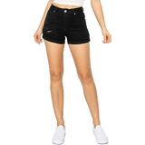 Mid Rise denim shorts with slightly destroyed details with rip and repair finish. Made with Recycled REPREVE Denim, making these sustainable and eco friendly. Whiskers and hand sanding with rolled cuffs. Traditional 5-pocket styling with zip fly and one button closure. These shorts are the perfect throw on pair for the summer to pair with crop tops, tees and sneakers. Hello sunshine.