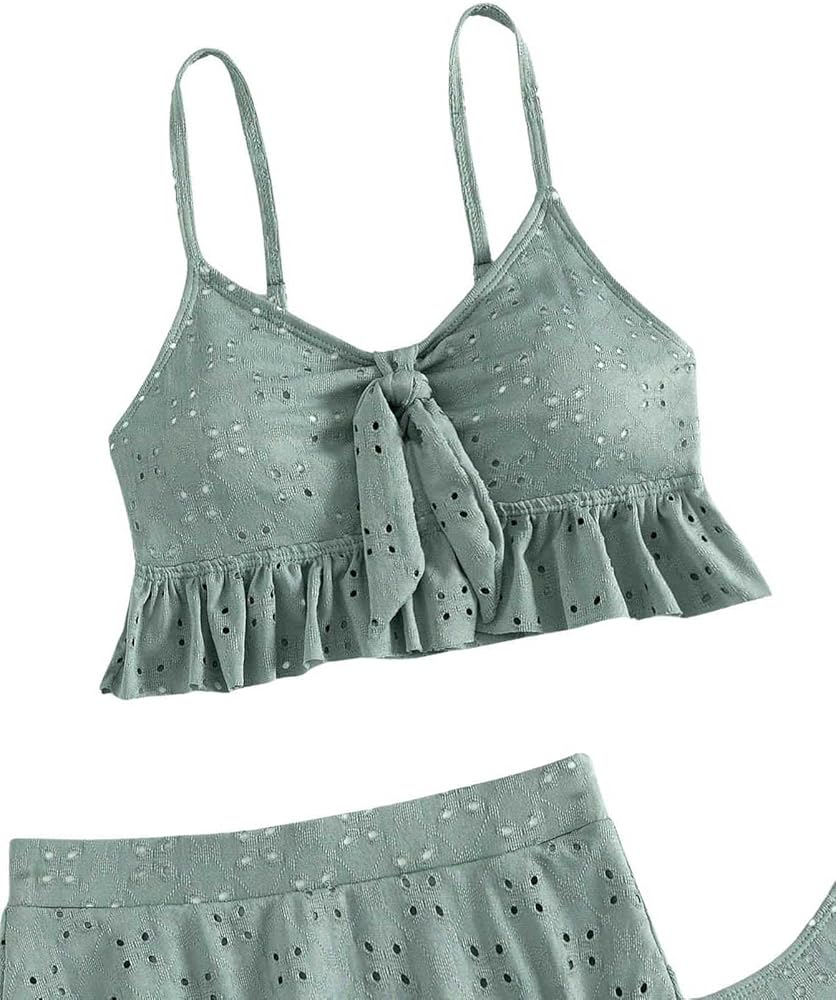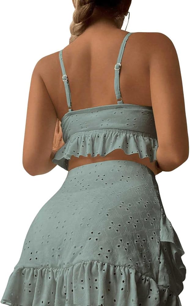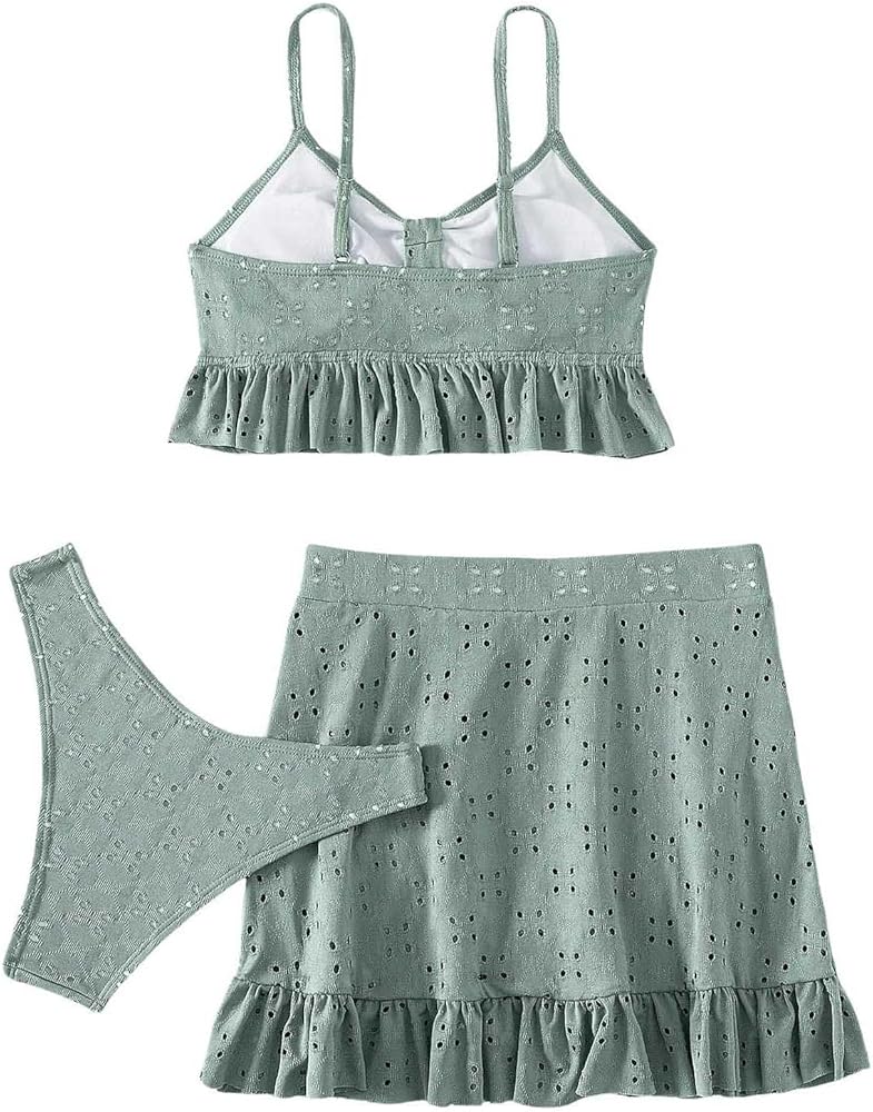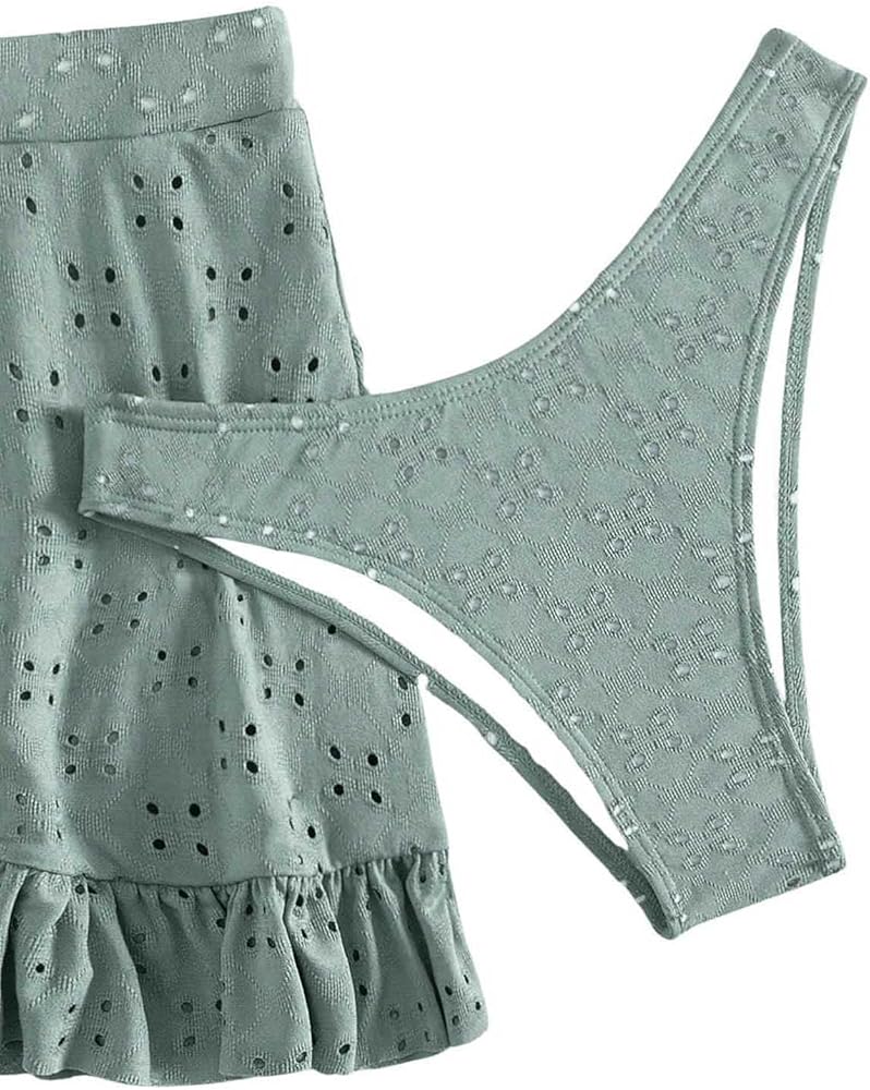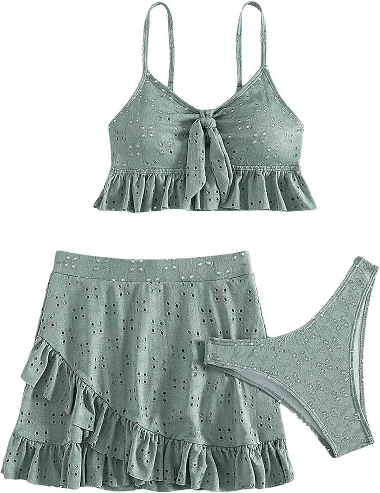 SweatyRocks Women's 3 Piece Bathing Suit Tie Front Ruffle Hem High Cut Bikini Tankini with Beach Skirt