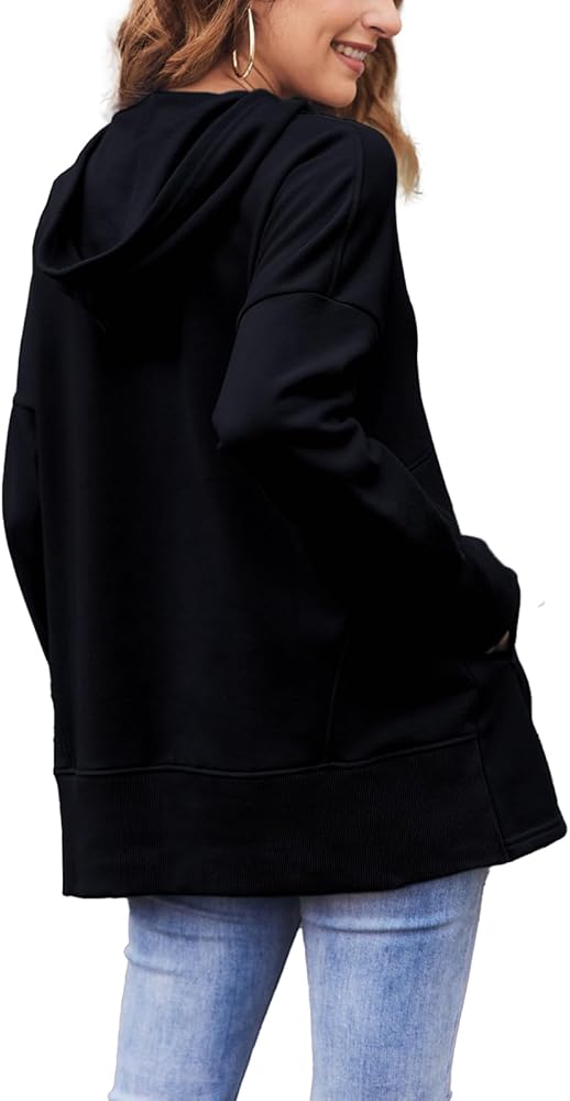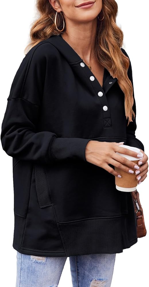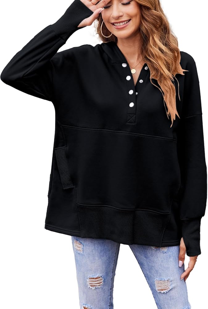 سويت شيرت بأزرار سفلية، وأكمام طويلة مضلعة مع فتحات للإبهام، وقلنسوة كاجوال وجيوب أمامية واسعة. تصميم ياقة بنصف زر مثالي لارتدائه وخلعه. يصل إلى أسفل الوركين مباشرة حتى تتمكن من ارتداء هذا بسهولة أكثر مع السراويل الضيقة تي شيرت برسومات وحذاء رياضي.