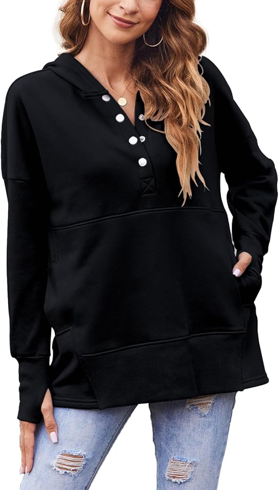 Button down sweatshirts,ribbed long sleeve with thumb holes,casual hooded and the front roomy pockets.Half button collar design perfect convenient for you to put on and take off.It hits right below your hips so you could easily wear this more casually with leggings, a graphic tee and sneakers.