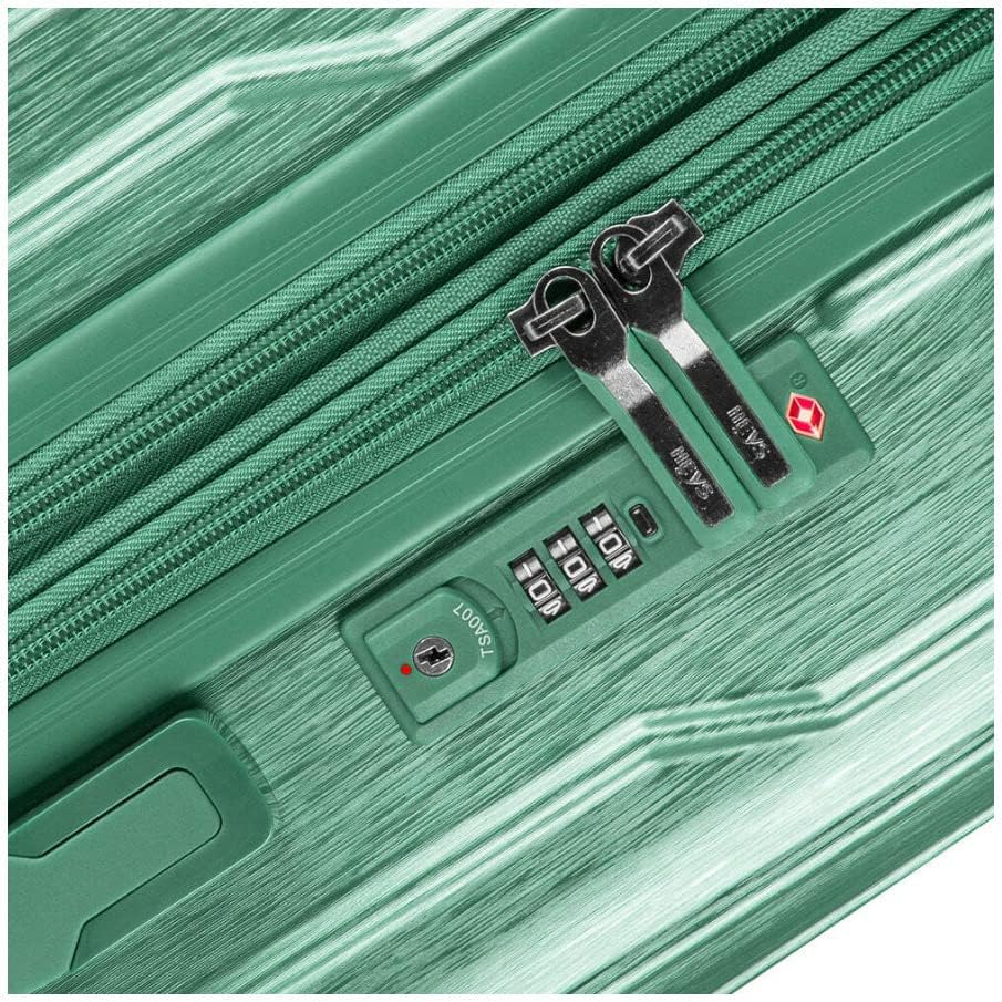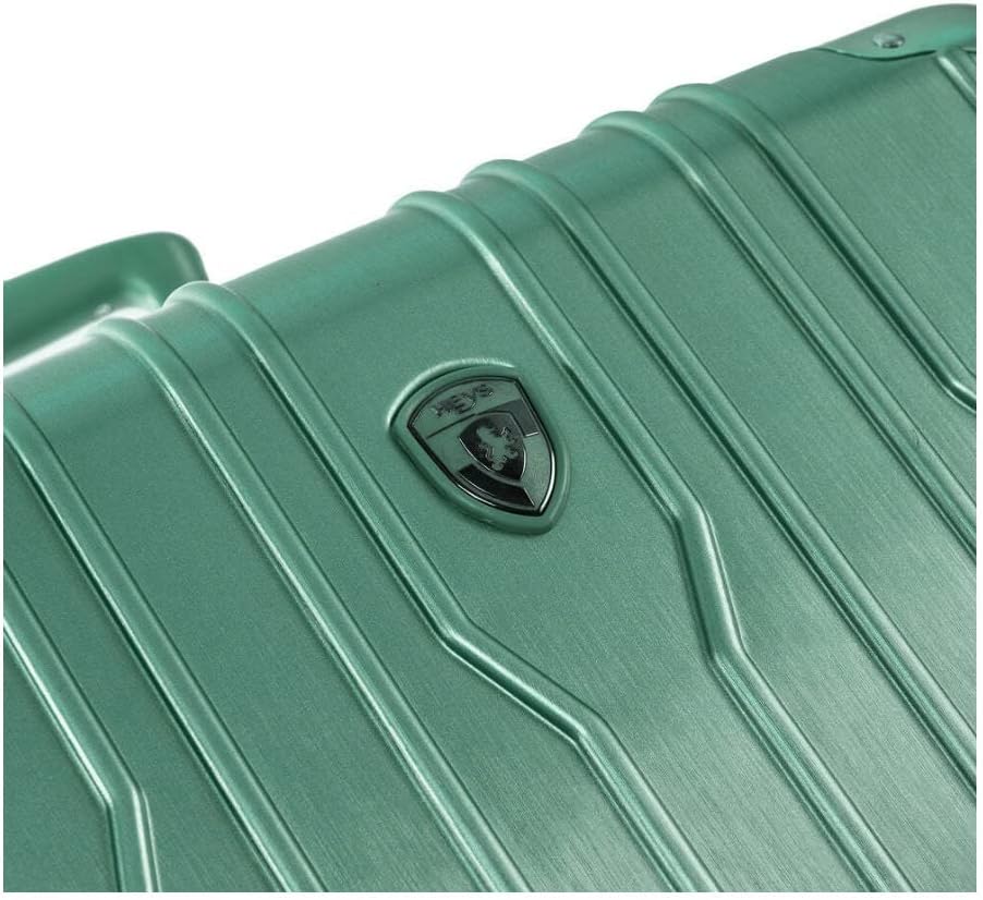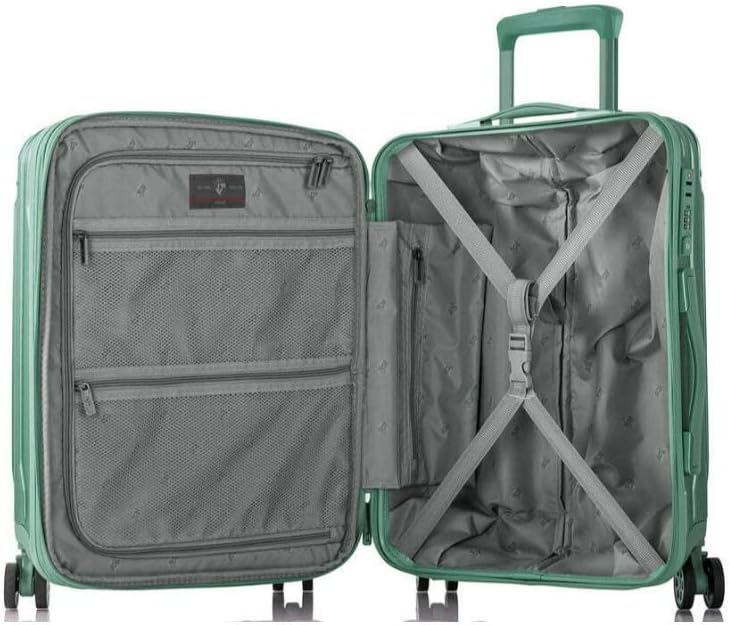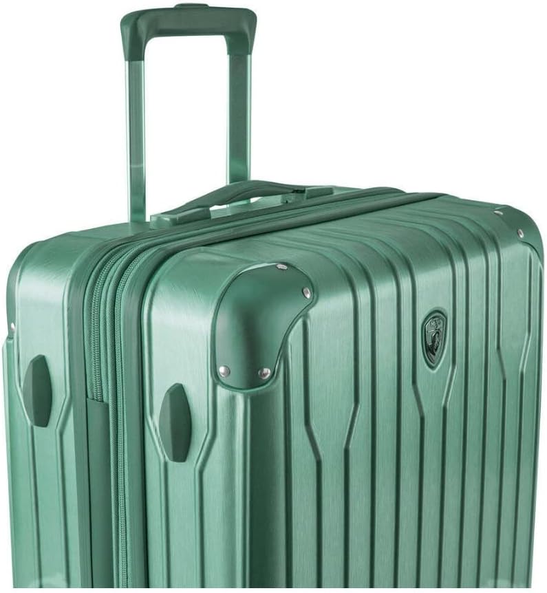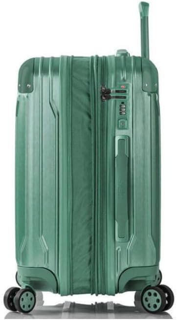 21-inch midnight green carry-on luggage Made with lightweight polycarbonate composite Metal corner guards to prevent damage Features fully lined with zippered divider Flush-mounted built-in TSA combination lock Expandable with a zipper-released expansion system Comfortable gel-cushioned top and side handles Easy-to-use telescopic handle system Adjustable multi-stage heights locking handle system 360-degree spinner wheels allow effortless motion