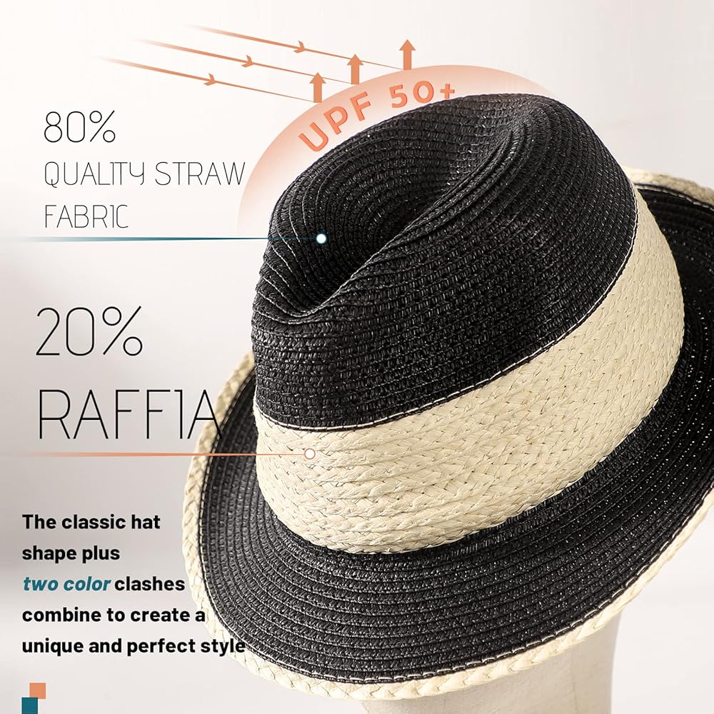 Material: Fedora hats for women is made of 20% raffia and 80% quality straw fabric with a UPF 50+ rating, the classic trilby hat shape plus two color clashes combine to create a unique and perfect style. Fedora hats for men material ensures durability, neither too stiff or too floppy, lightweight and comfortable.