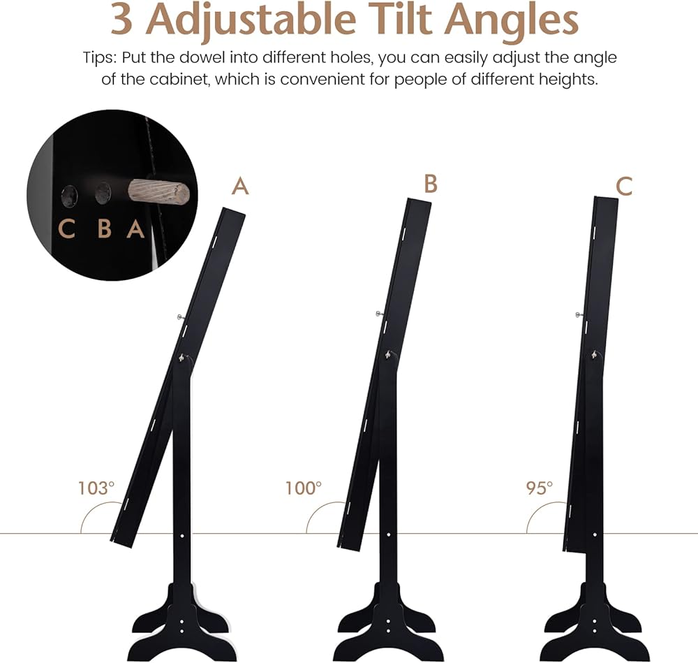 💍【Full-length Mirror with 3 Tilt Angles】: The full-length mirror measures 9” x 40”, allowing you to have a full vision of your body. Meanwhile, there are 3 holes on both sides of the jewelry cabinet, so the mirror angle can be adjusted in 3 options according to your height.