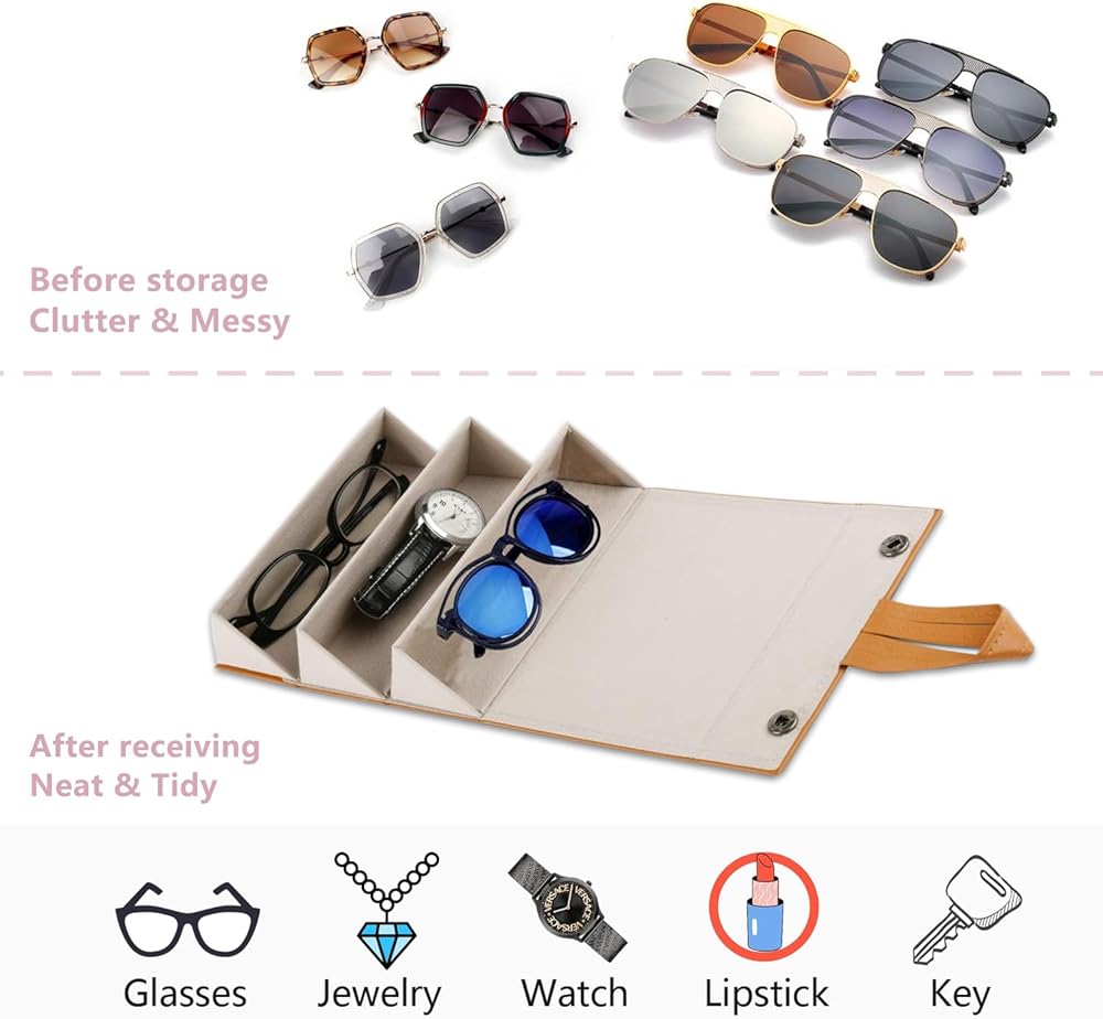 【Multifunctional Use】Our eyeglasses case not only as a sunglasses organizer, but also store your glasses, watches, necklaces, earrings, cosmetics and other small items. Strong protection with a hard shell, so it keeps everything safe.