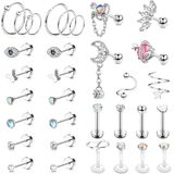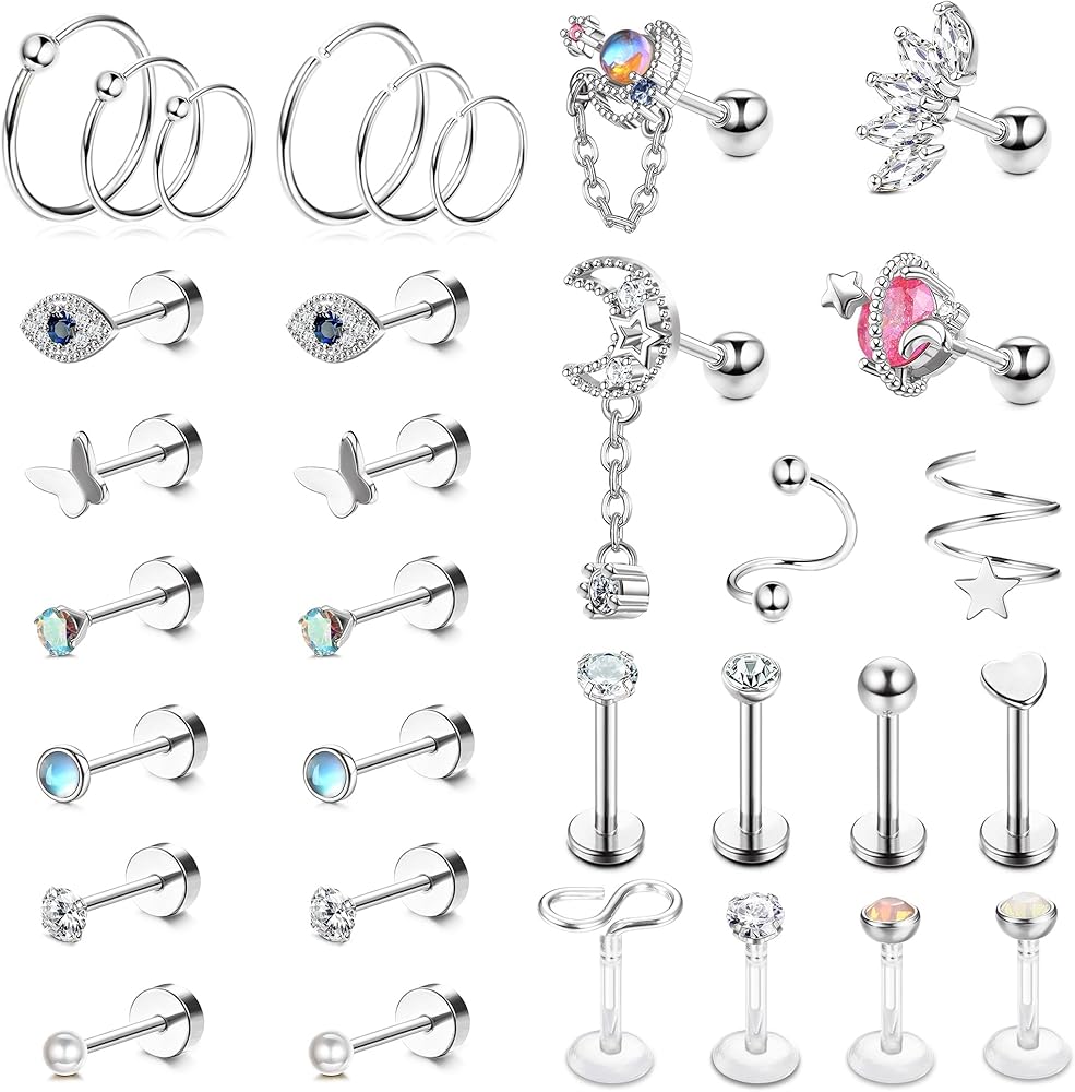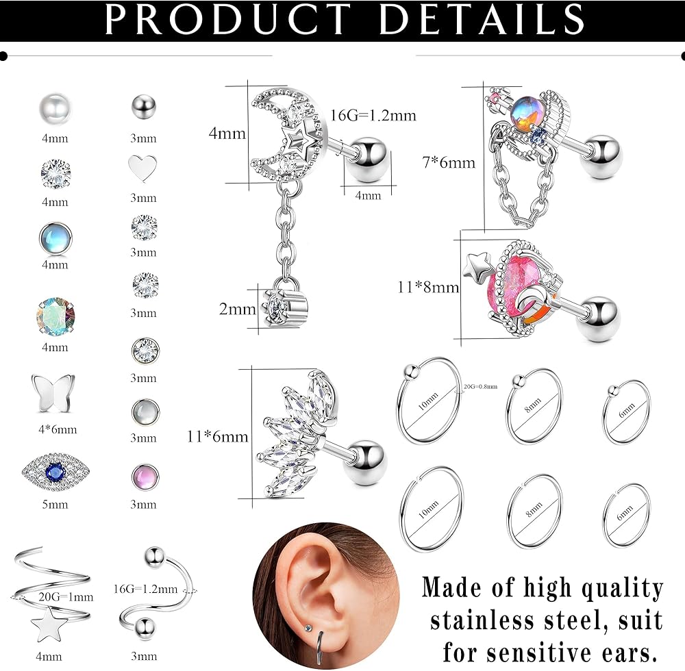 مجموعة أقراط غضروفية - مجموعة واحدة من 32 قطعة من أقراط الغضروف، بما في ذلك 16 قطعة من أقراط الغضروف، و6 قطع من أقراط الغضروف، وقطعتين من الأقراط الحلزونية على شكل حرف S و8 قطع من أقراط الزنمة، وأقراط الغضروف بأنماط مختلفة تضيف ألوانًا فريدة وجذابة إلى فستانك اليومي .